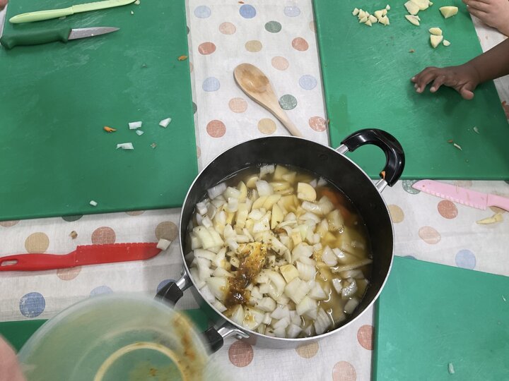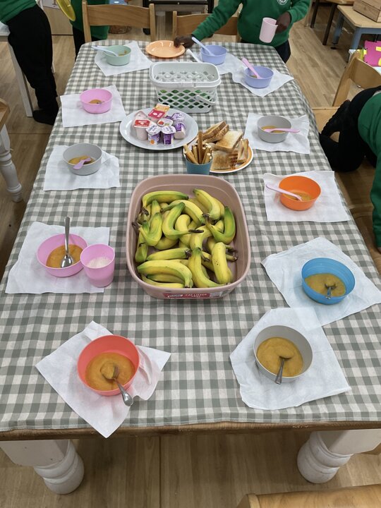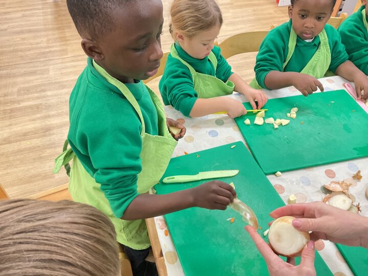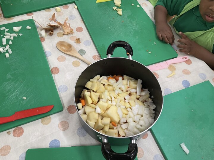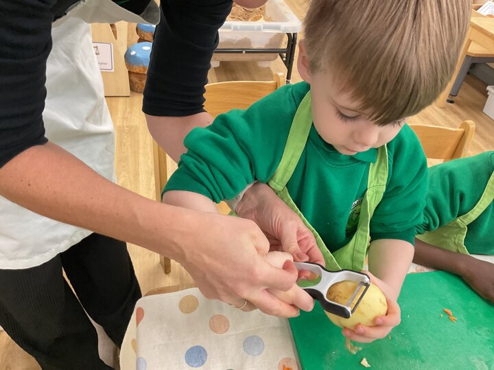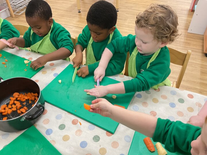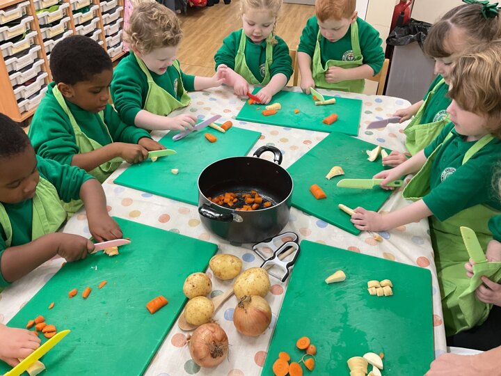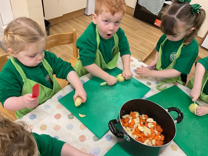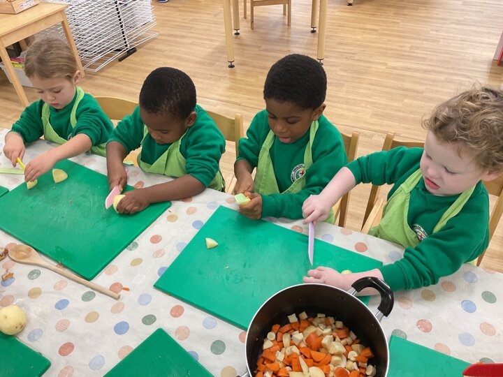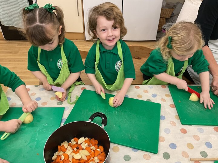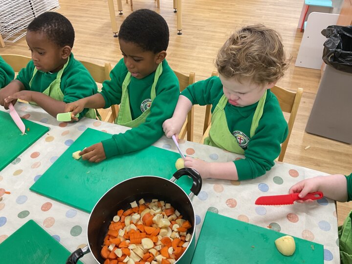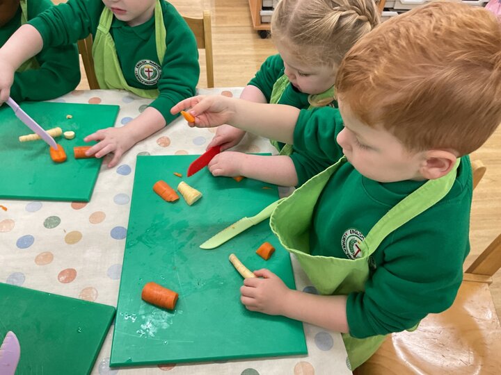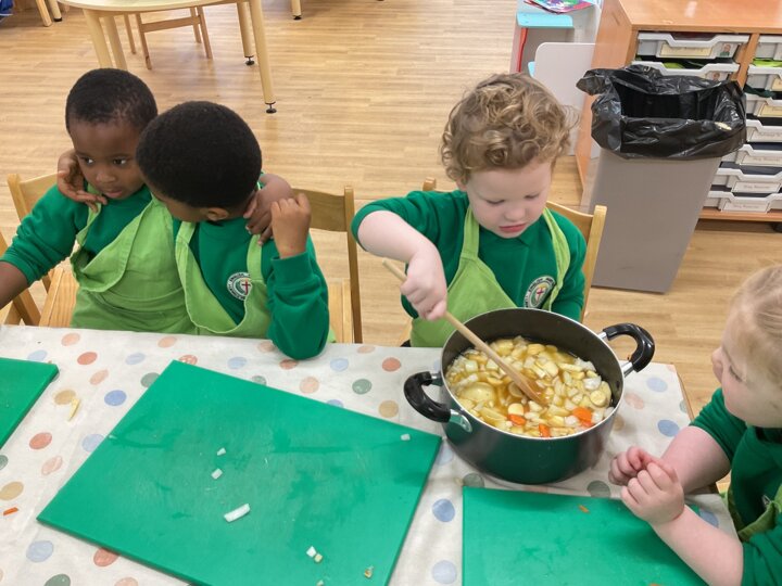 This week the children made vegetable soup to eat as part of their snack. They used their cutting, chopping and peeling skills to prepare the different vegetables. We talked about where vegetables grow and how they are full of goodness. Well done children for listening and following the recipe to make this delicious soup!