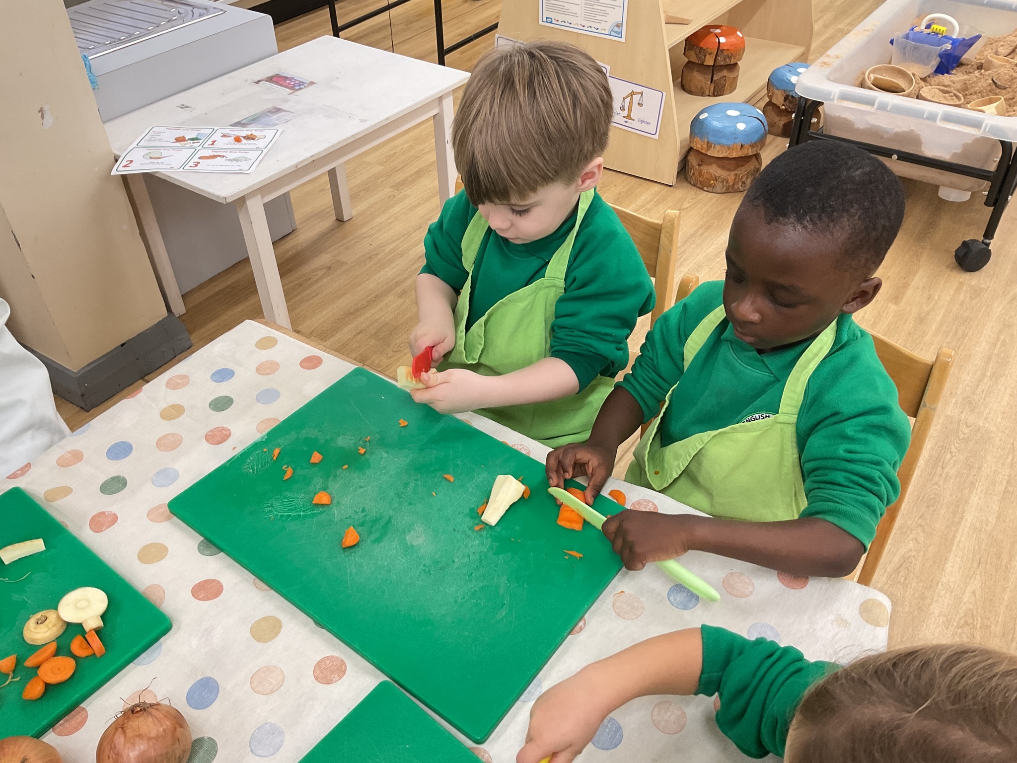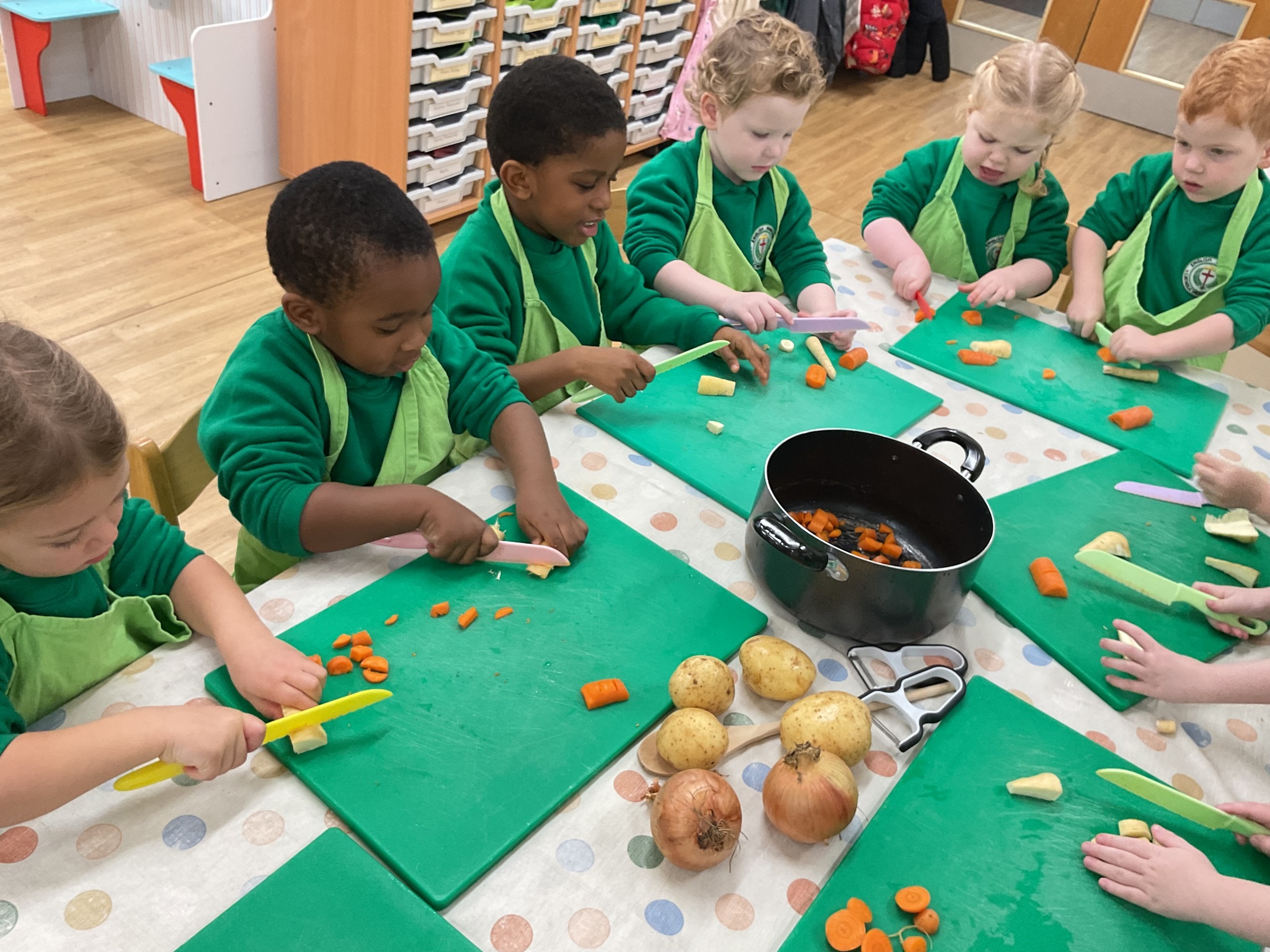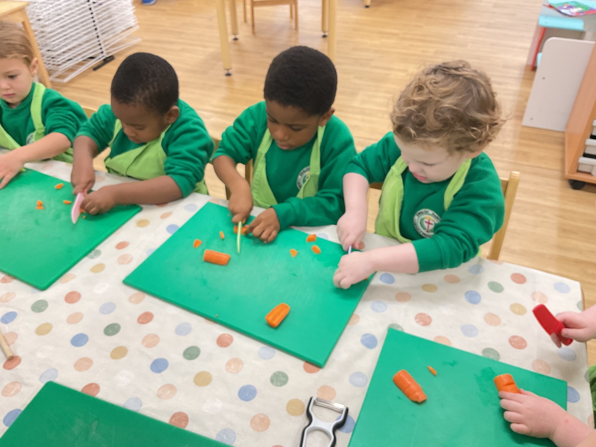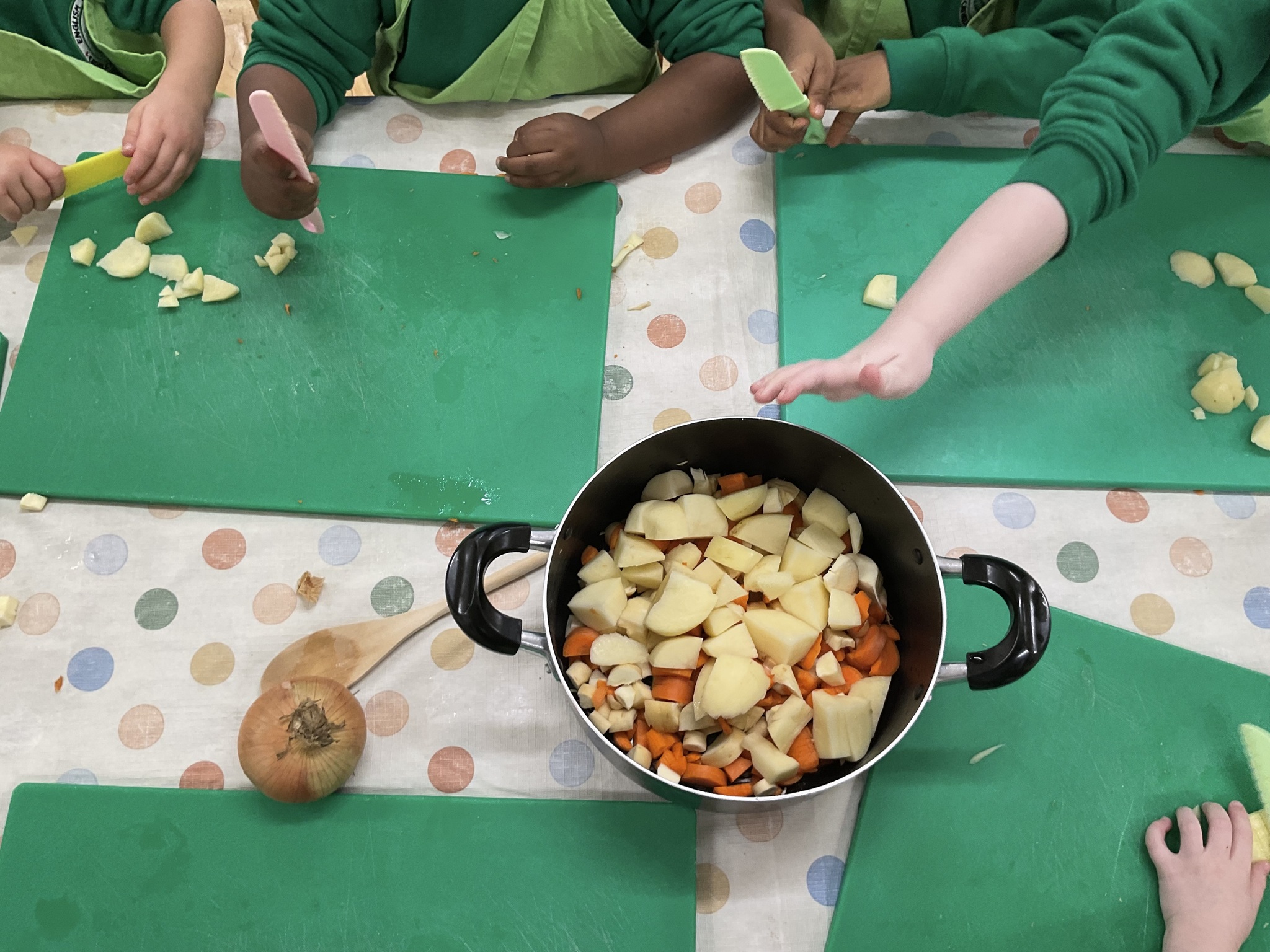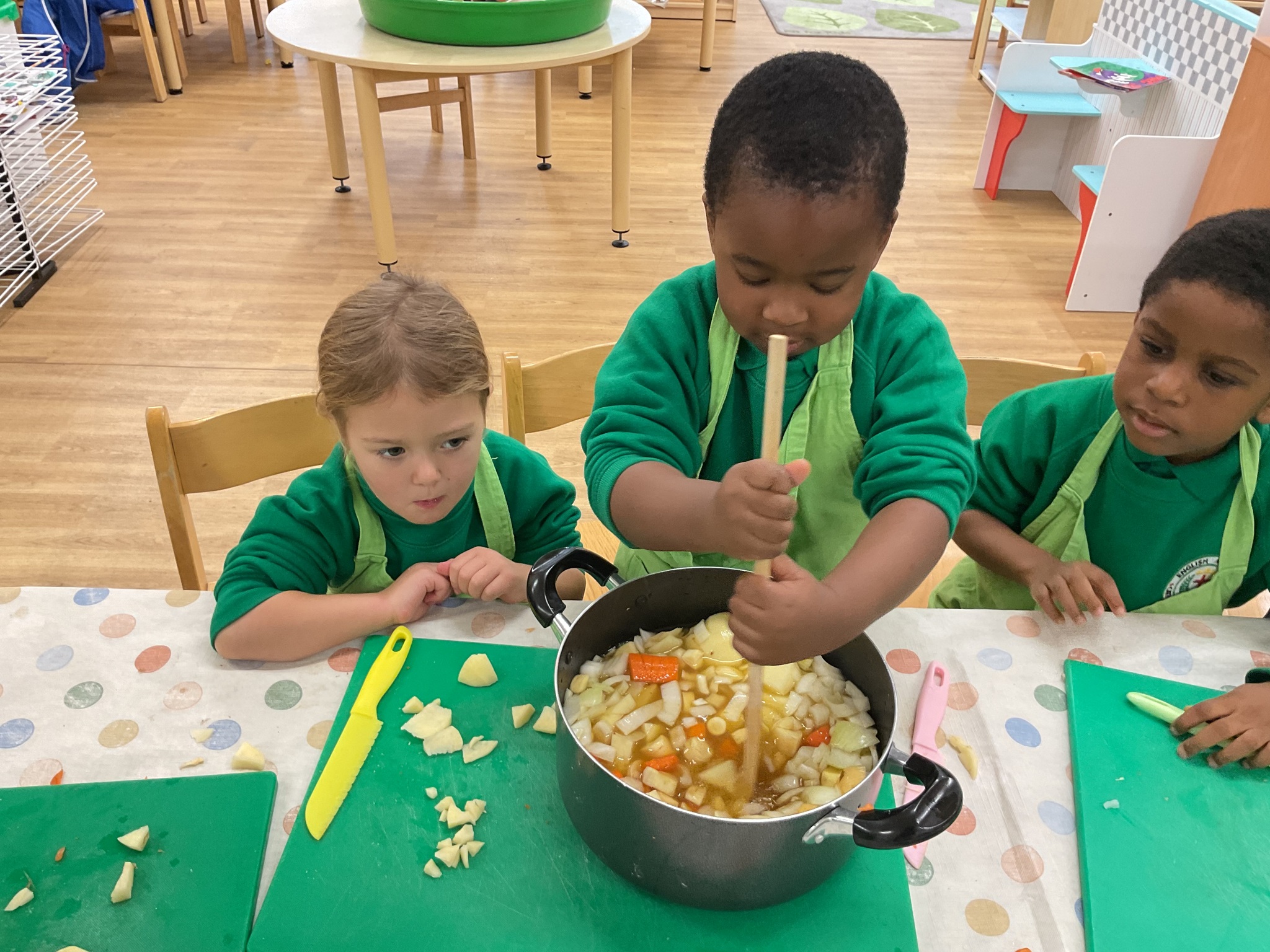 This week the children made vegetable soup to eat as part of their snack. They used their cutting, chopping and peeling skills to prepare the different vegetables. We talked about where vegetables grow and how they are full of goodness. Well done children for listening and following the recipe to make this delicious soup!