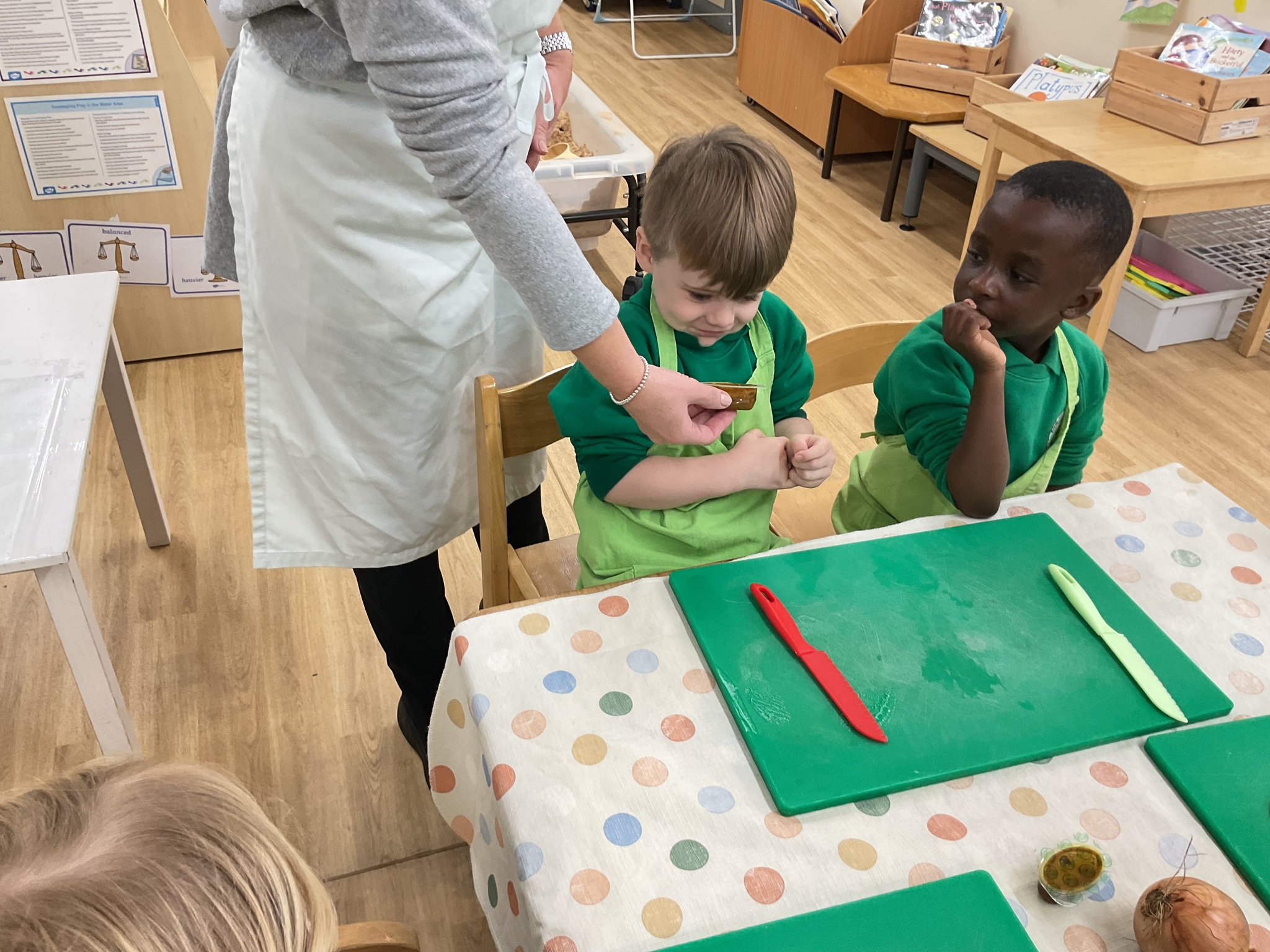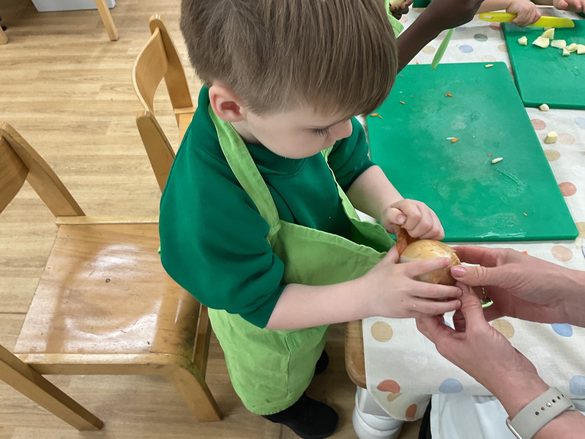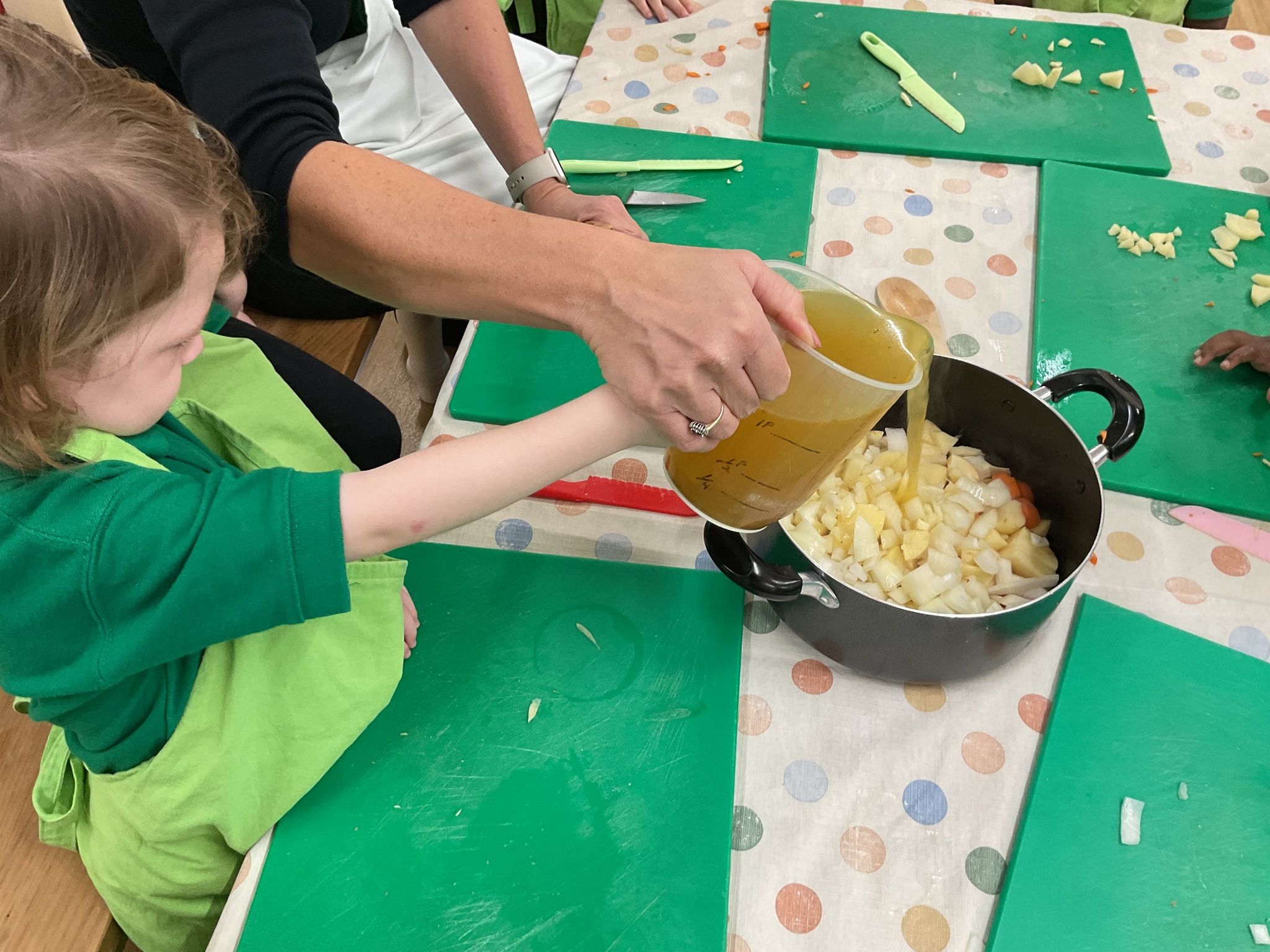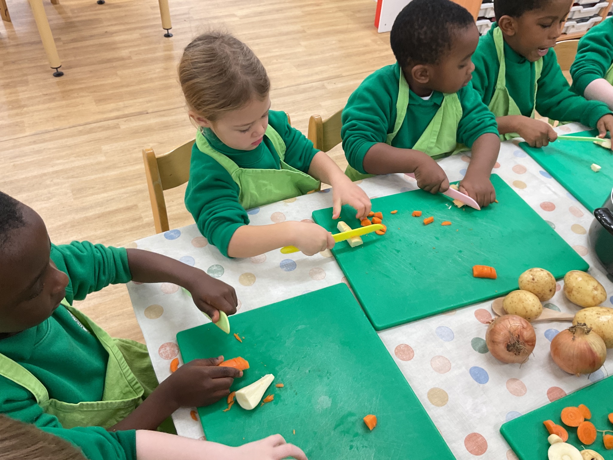 This week the children made vegetable soup to eat as part of their snack. They used their cutting, chopping and peeling skills to prepare the different vegetables. We talked about where vegetables grow and how they are full of goodness. Well done children for listening and following the recipe to make this delicious soup!