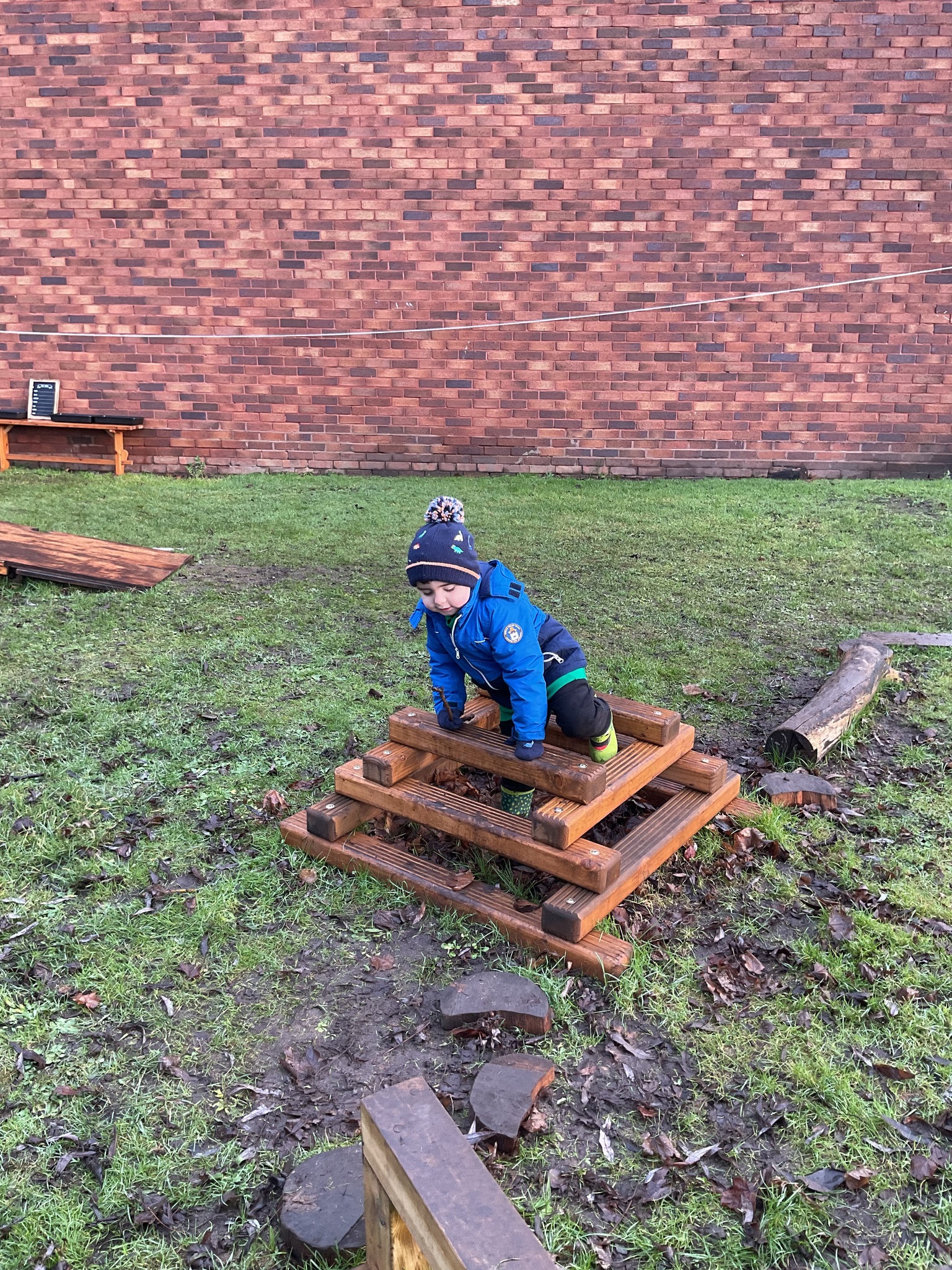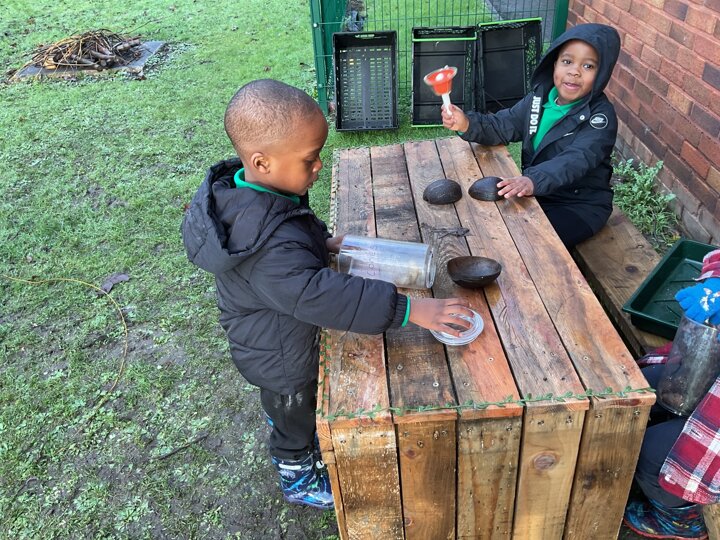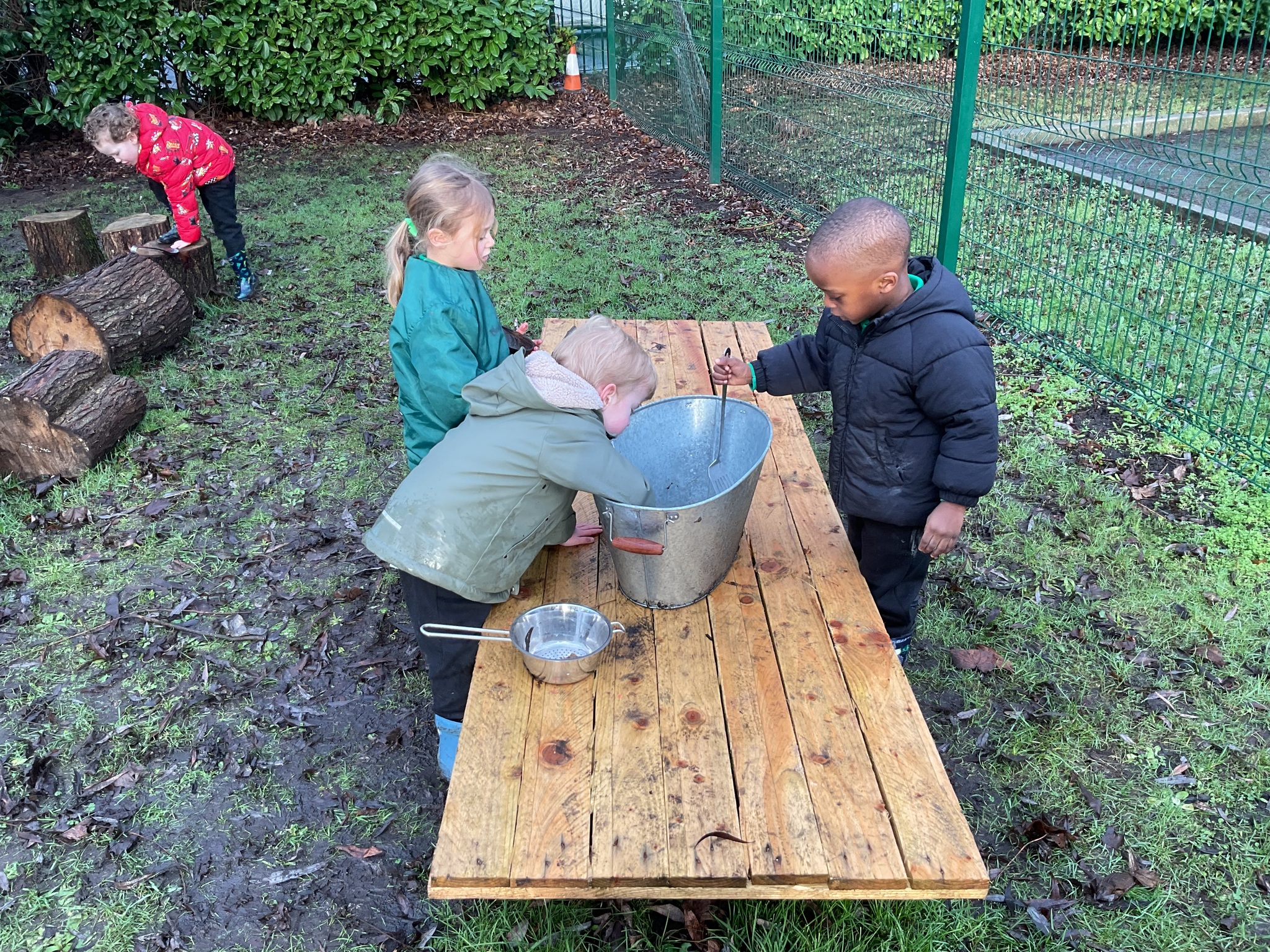 The children are enjoying talking, taking turns and playing together outdoors. They are collecting natural resources to make potions, hot chocolates and cups of warm tea. They are also practising moving and balancing on the the equipment.
