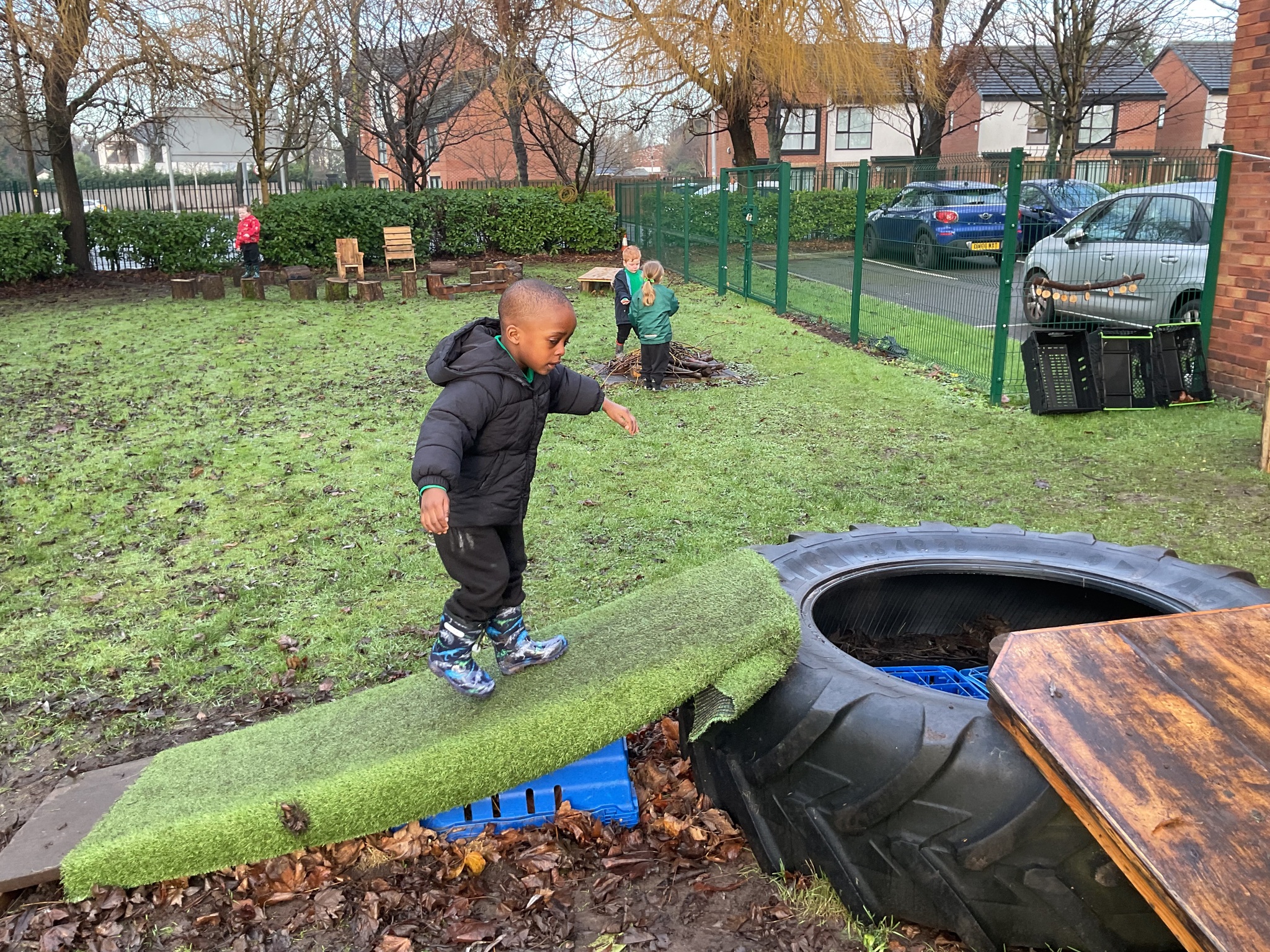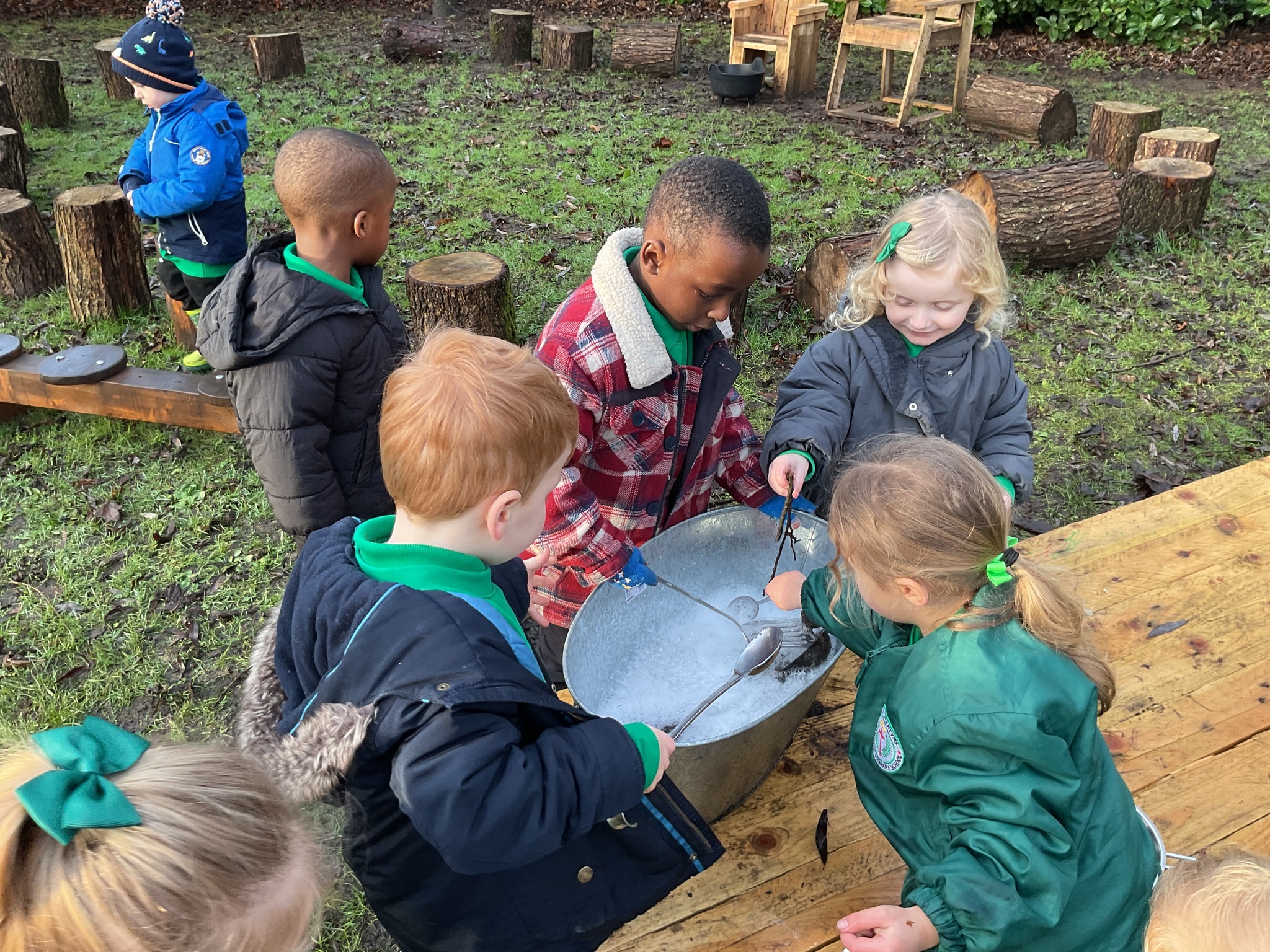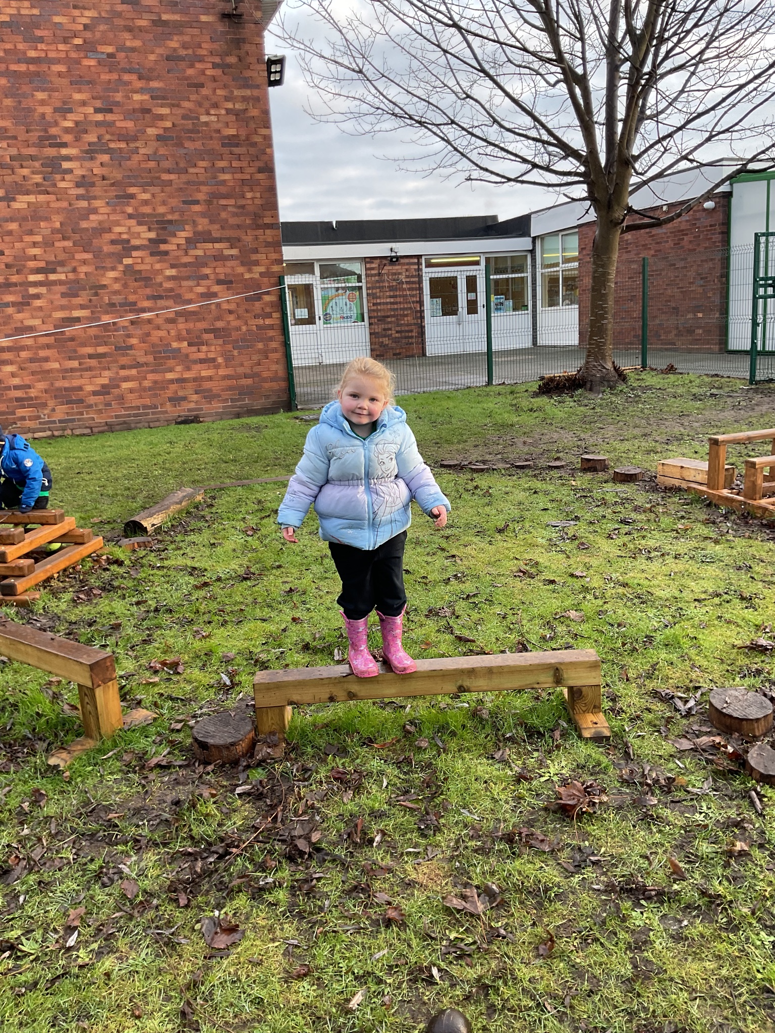 The children are enjoying talking, taking turns and playing together outdoors. They are collecting natural resources to make potions, hot chocolates and cups of warm tea. They are also practising moving and balancing on the the equipment.