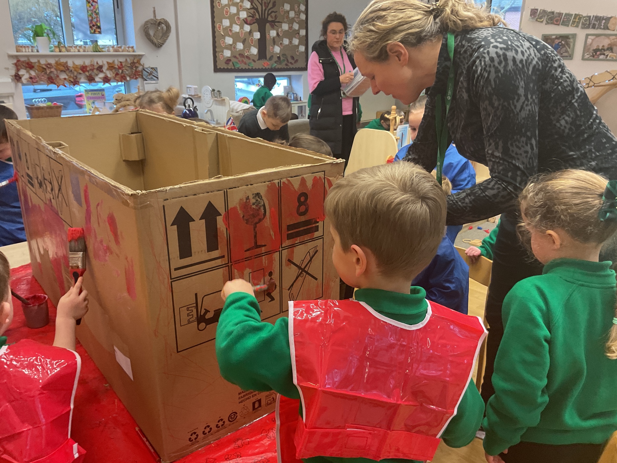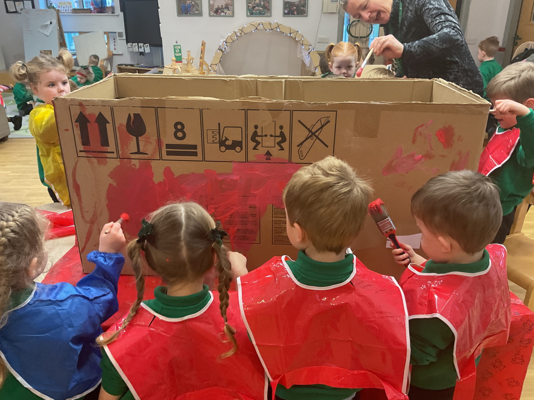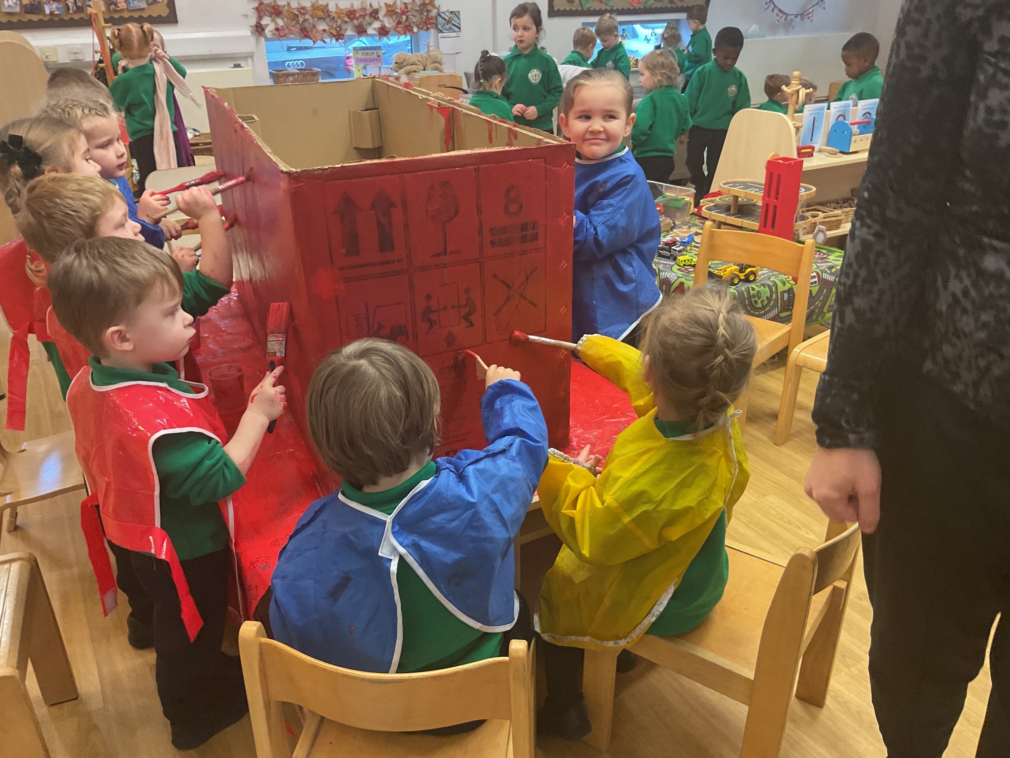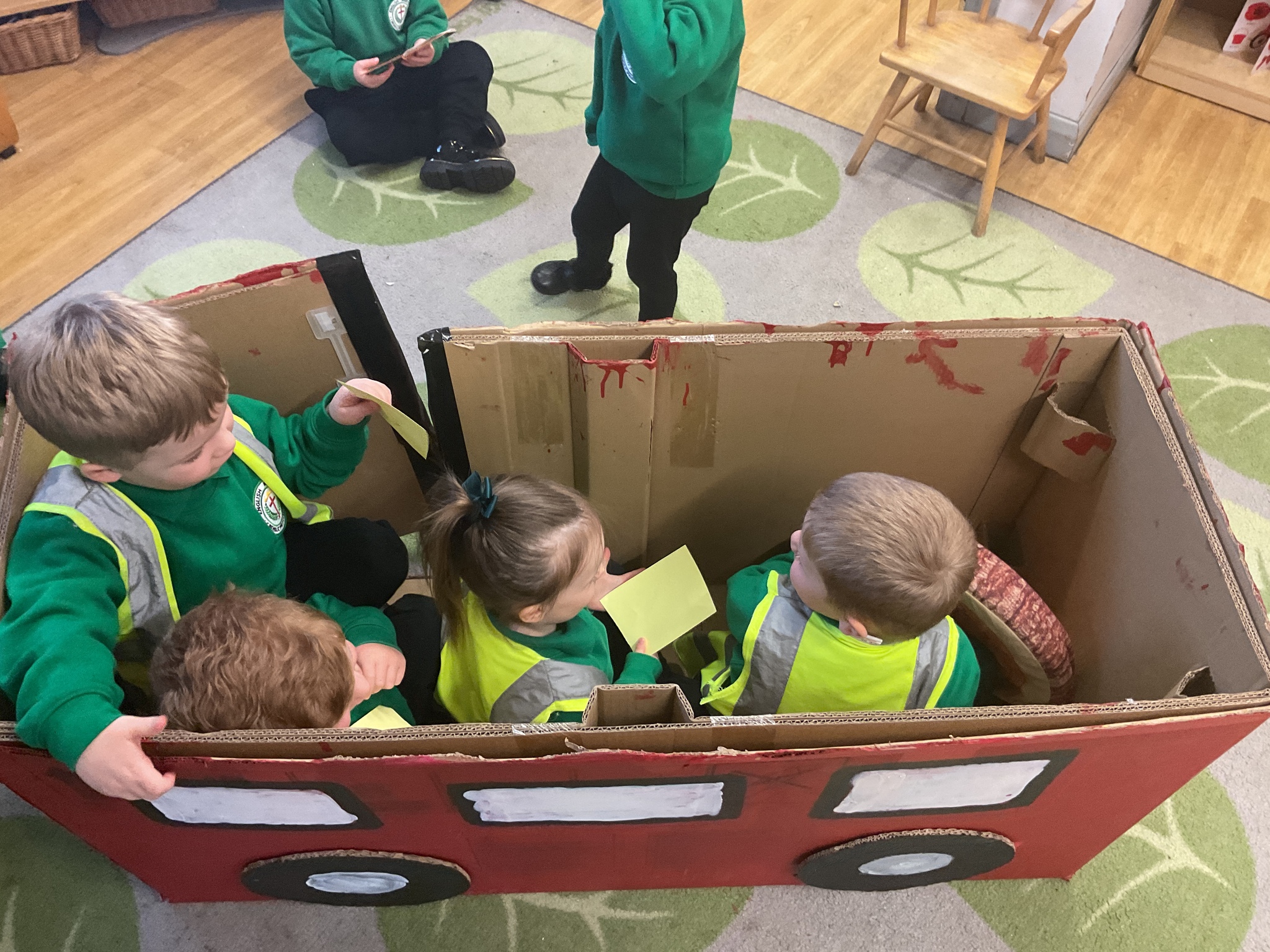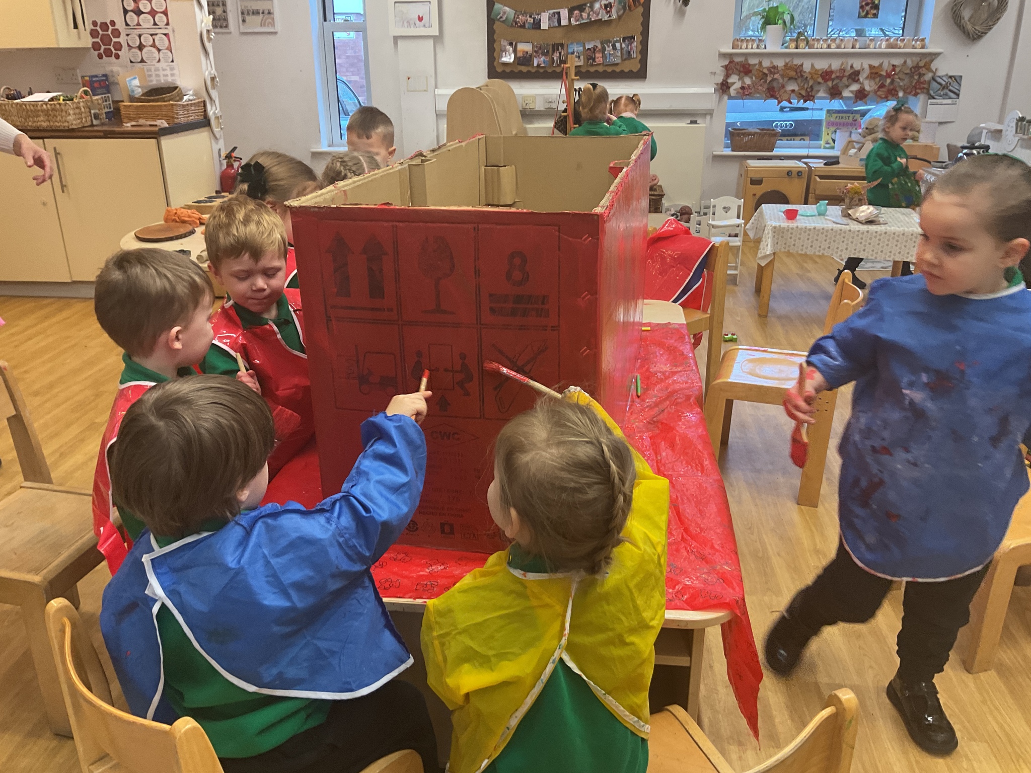 Following on from our ‘Naughty Bus’ book the children were keen to make their own bus. We found a sturdy box and the children took over, painting and creating together to get the job done! Next for the driving and travelling. We have also been talking about finding routes as part of our mathematical learning so children were heard describing the route they were taking. The bus journeys require collaboration and turn-taking but are lots of fun too.