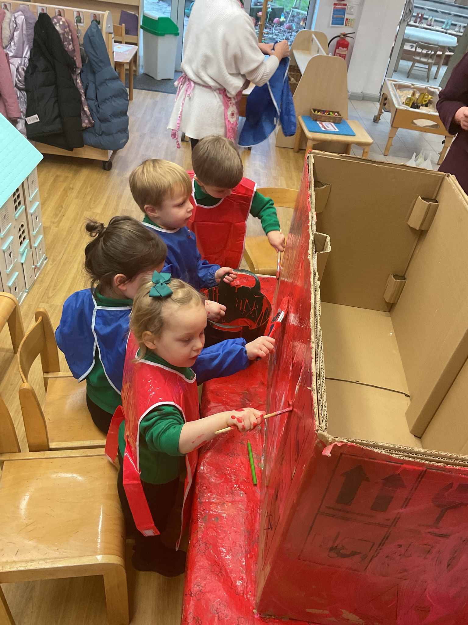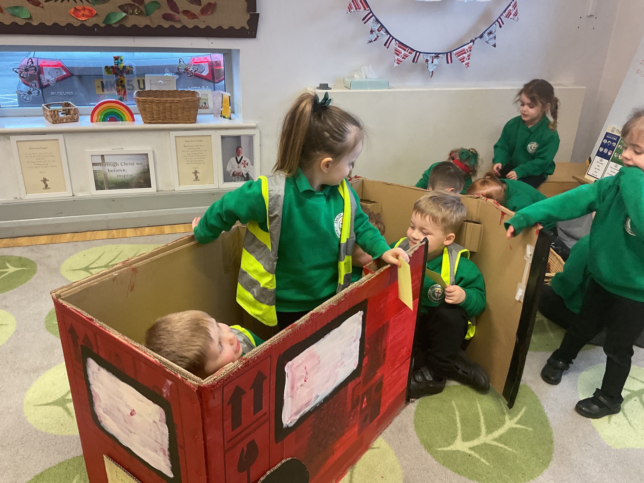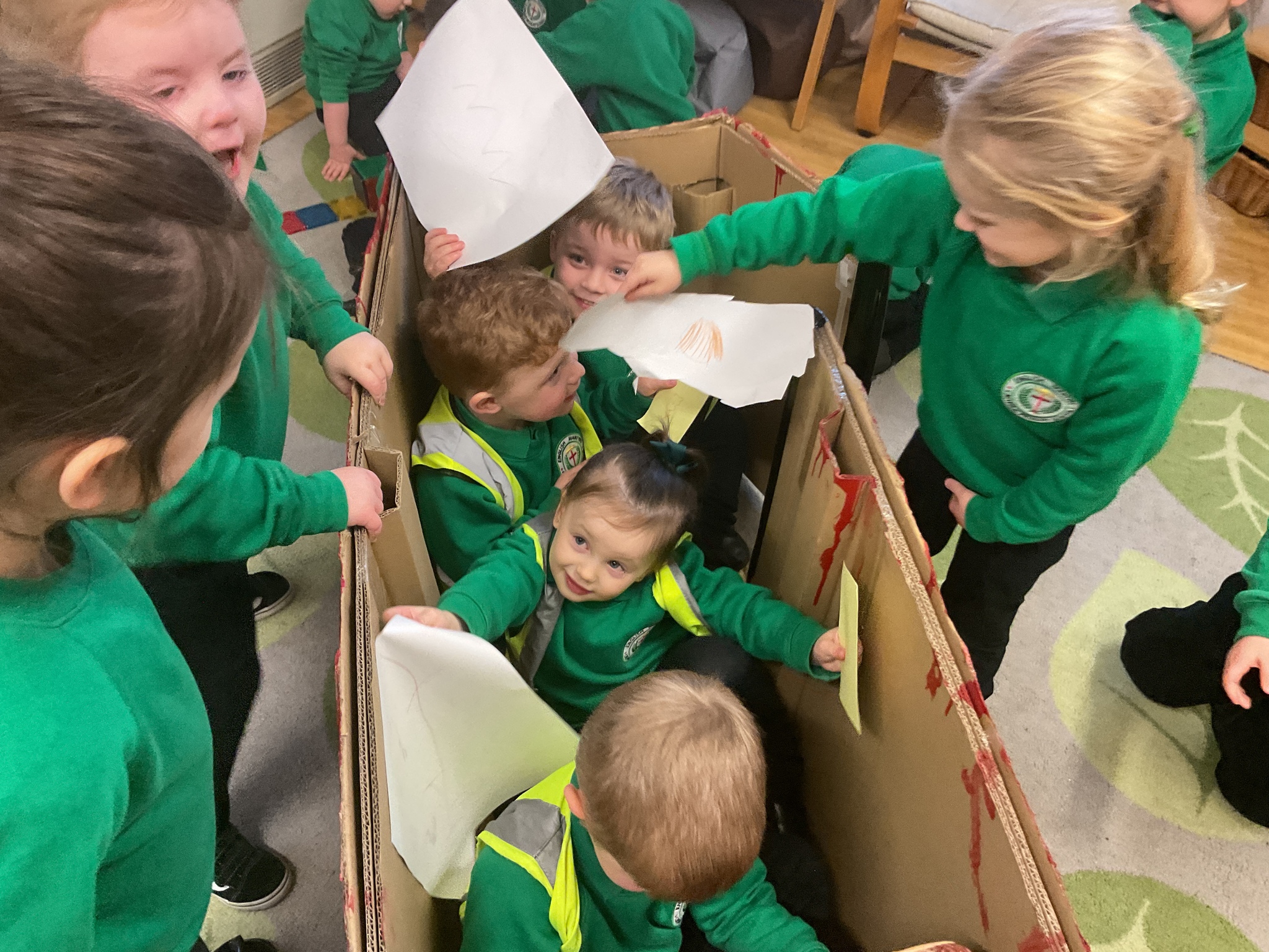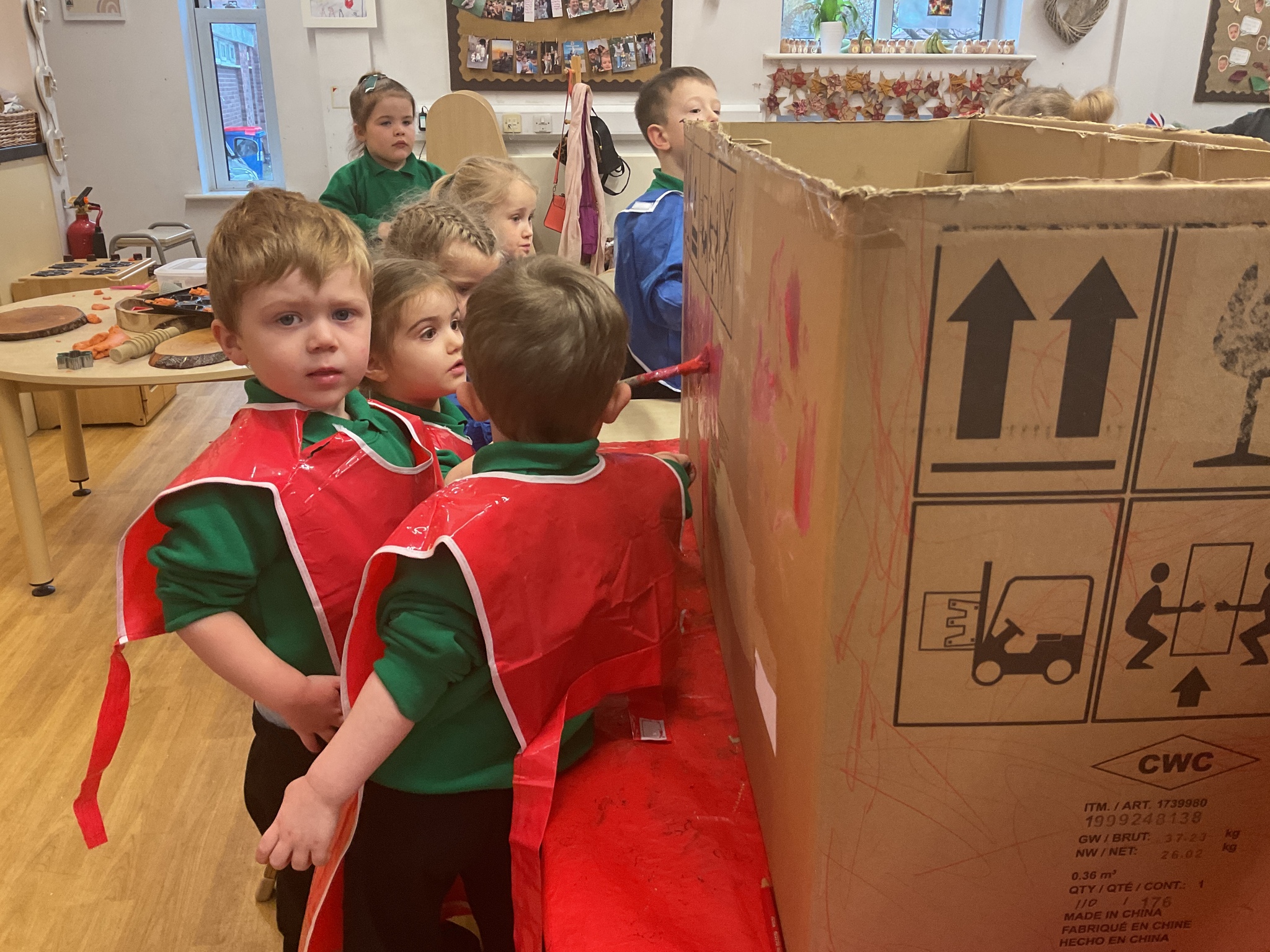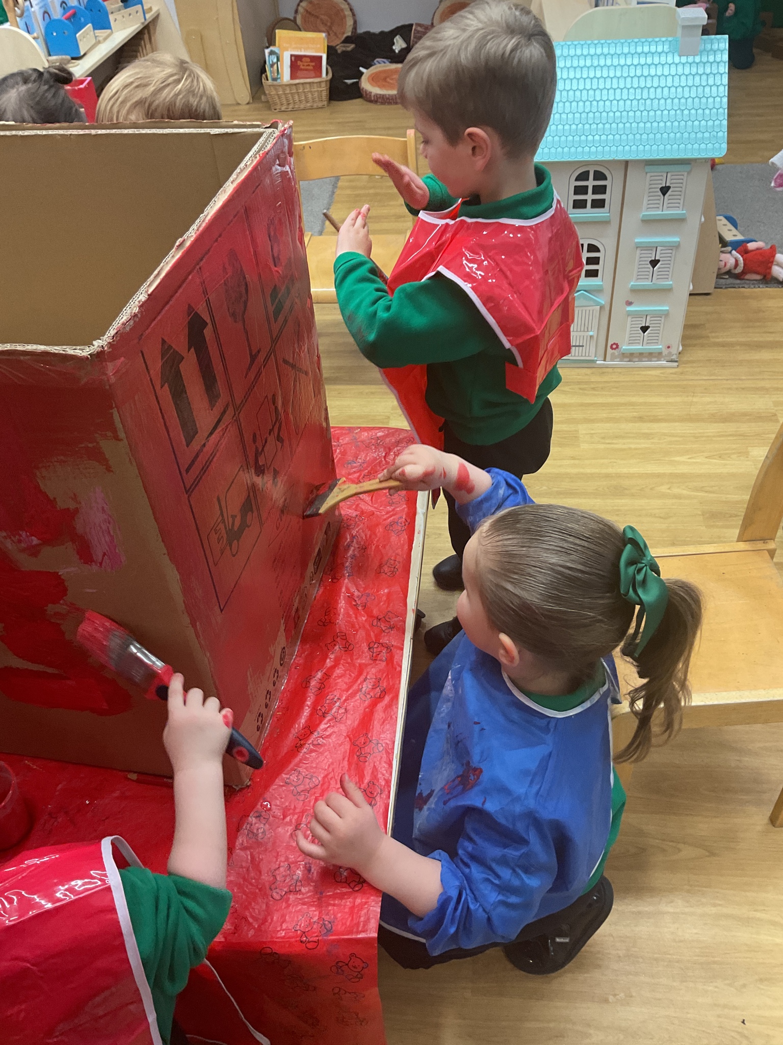 Following on from our ‘Naughty Bus’ book the children were keen to make their own bus. We found a sturdy box and the children took over, painting and creating together to get the job done! Next for the driving and travelling. We have also been talking about finding routes as part of our mathematical learning so children were heard describing the route they were taking. The bus journeys require collaboration and turn-taking but are lots of fun too.