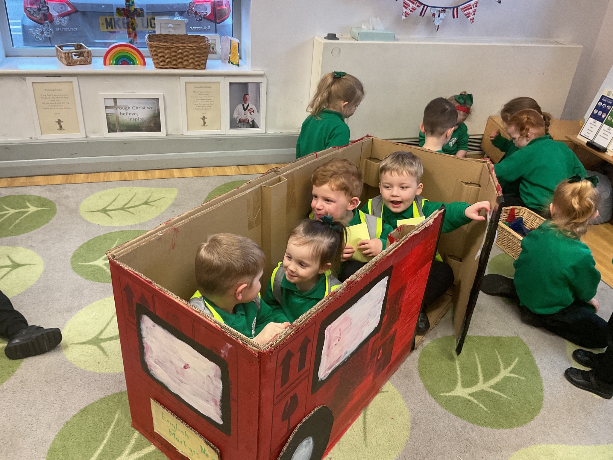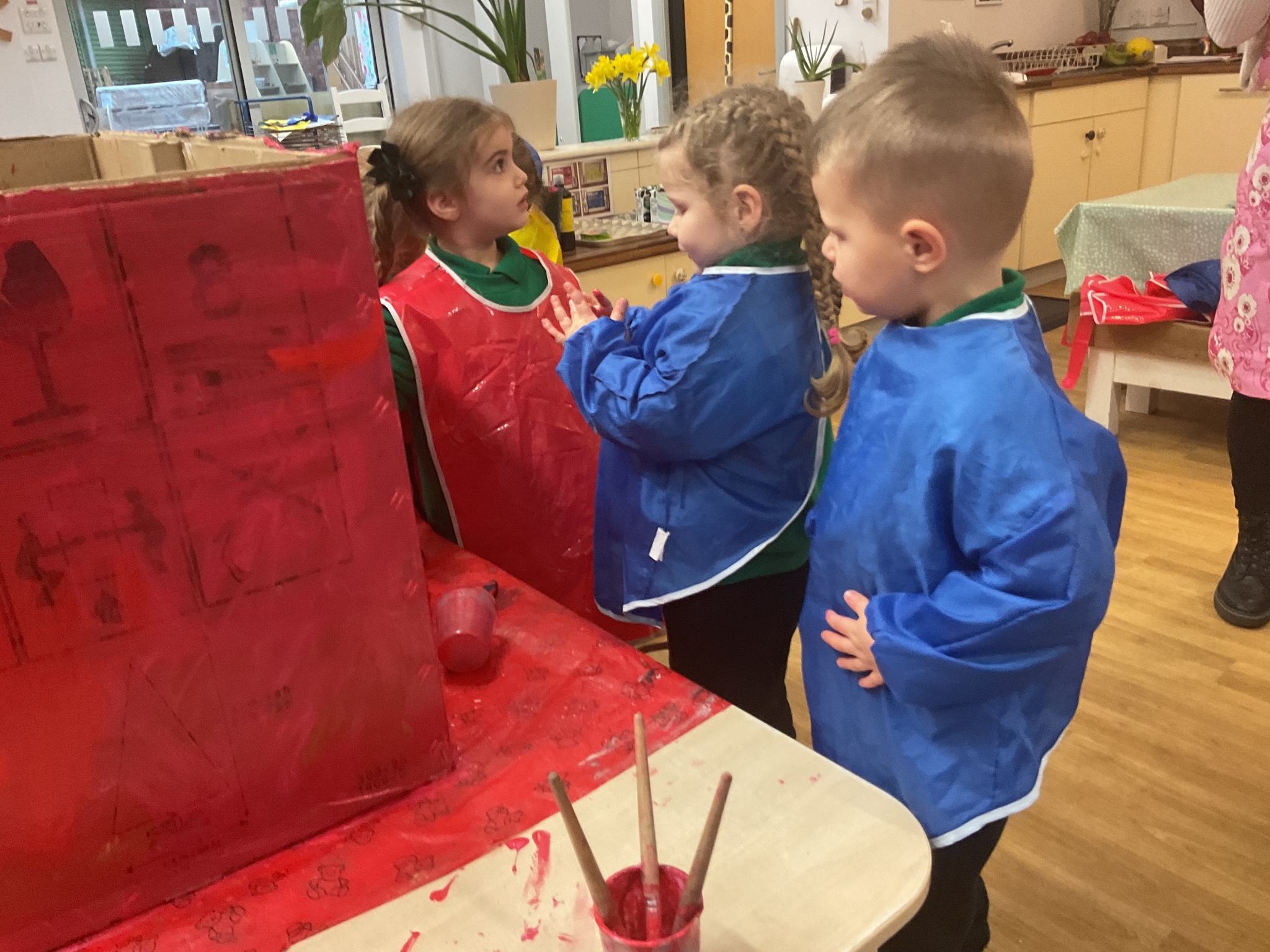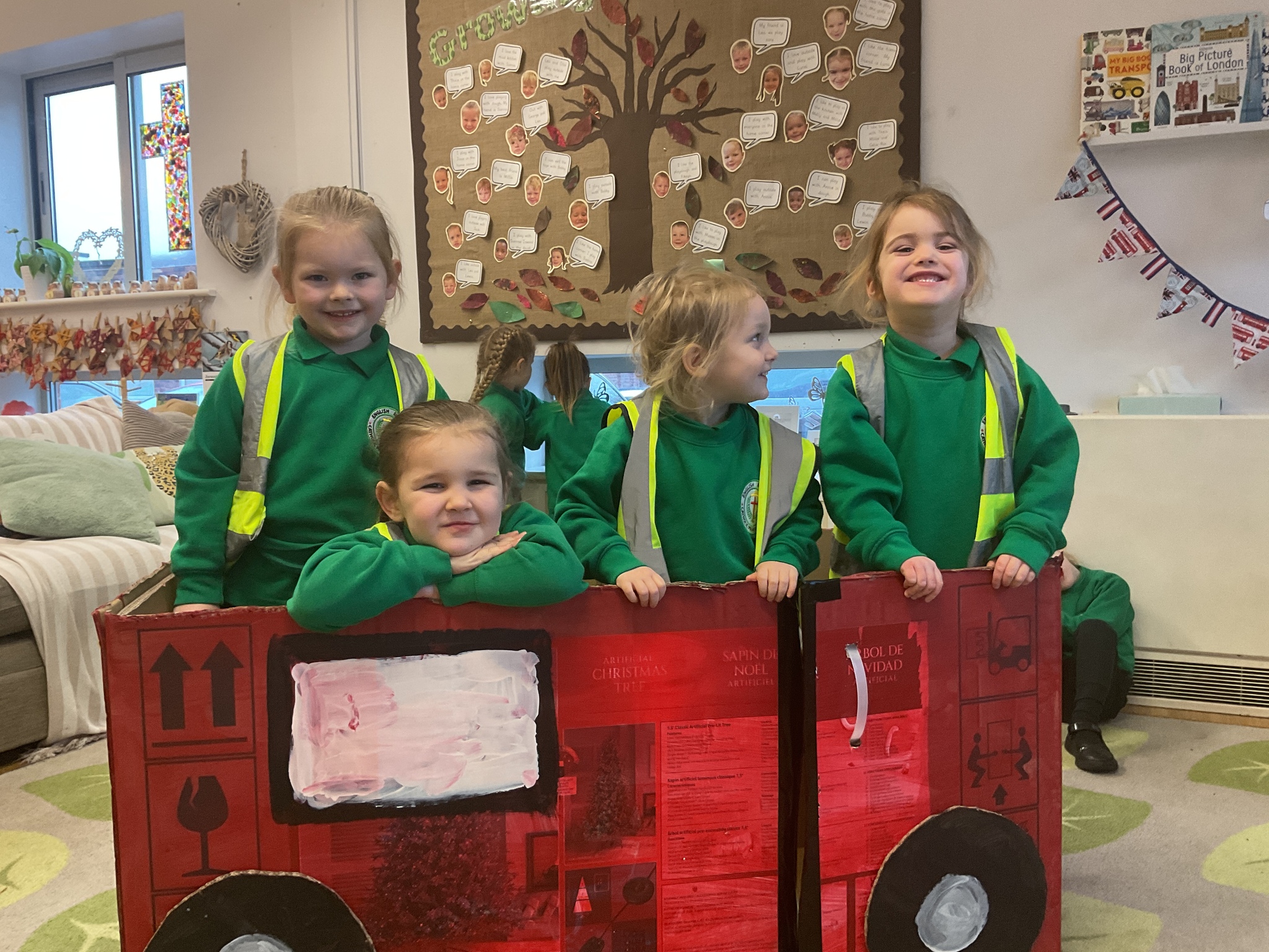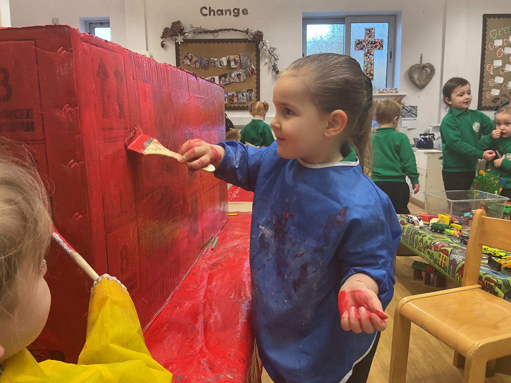 Following on from our ‘Naughty Bus’ book the children were keen to make their own bus. We found a sturdy box and the children took over, painting and creating together to get the job done! Next for the driving and travelling. We have also been talking about finding routes as part of our mathematical learning so children were heard describing the route they were taking. The bus journeys require collaboration and turn-taking but are lots of fun too.