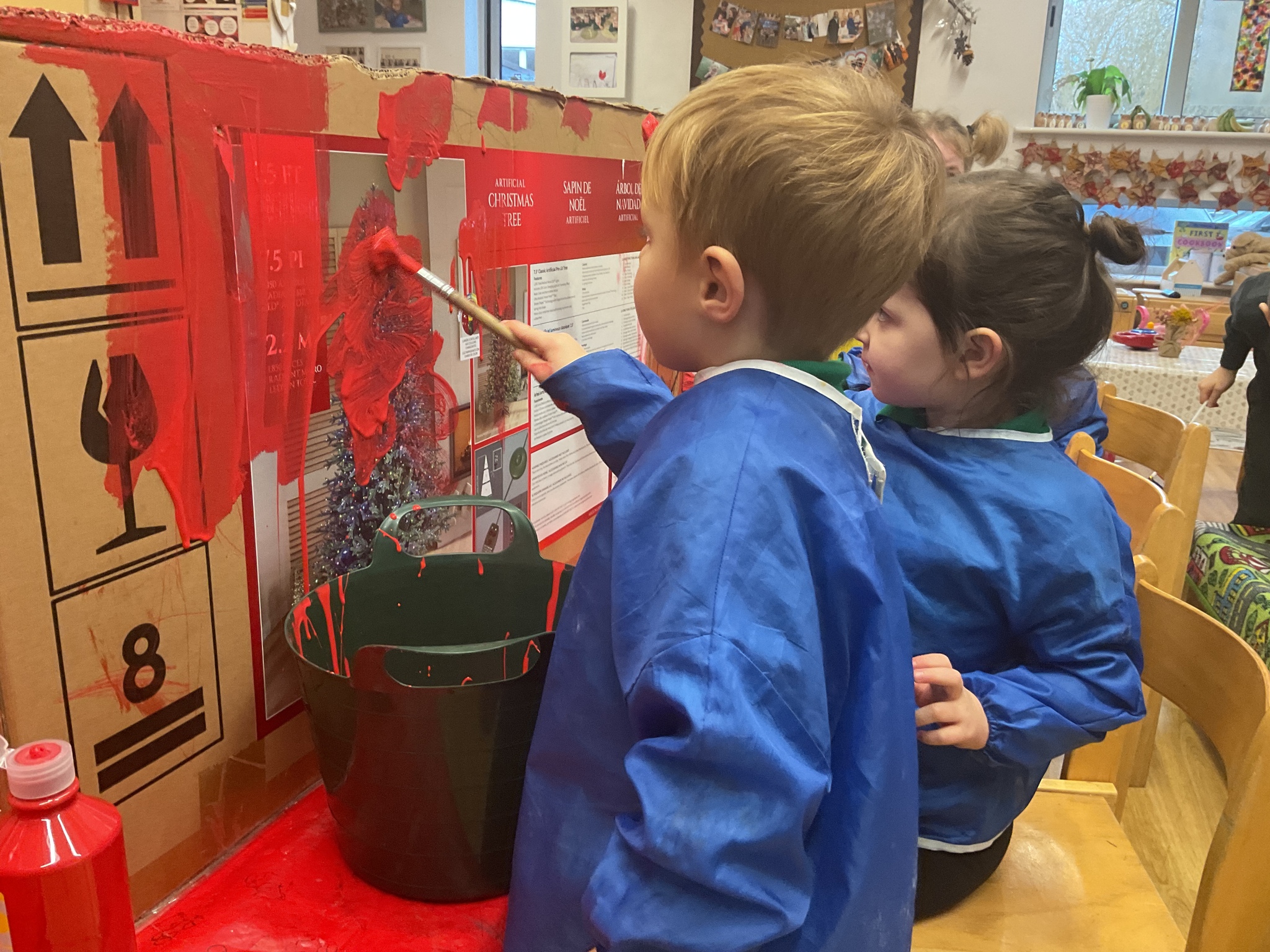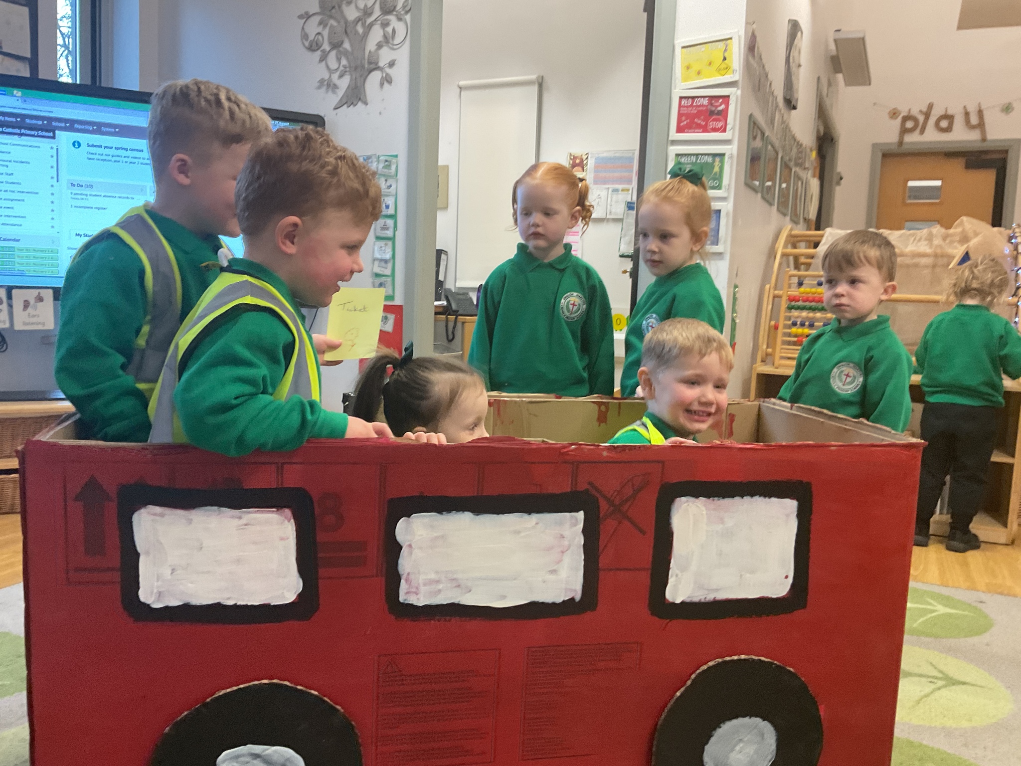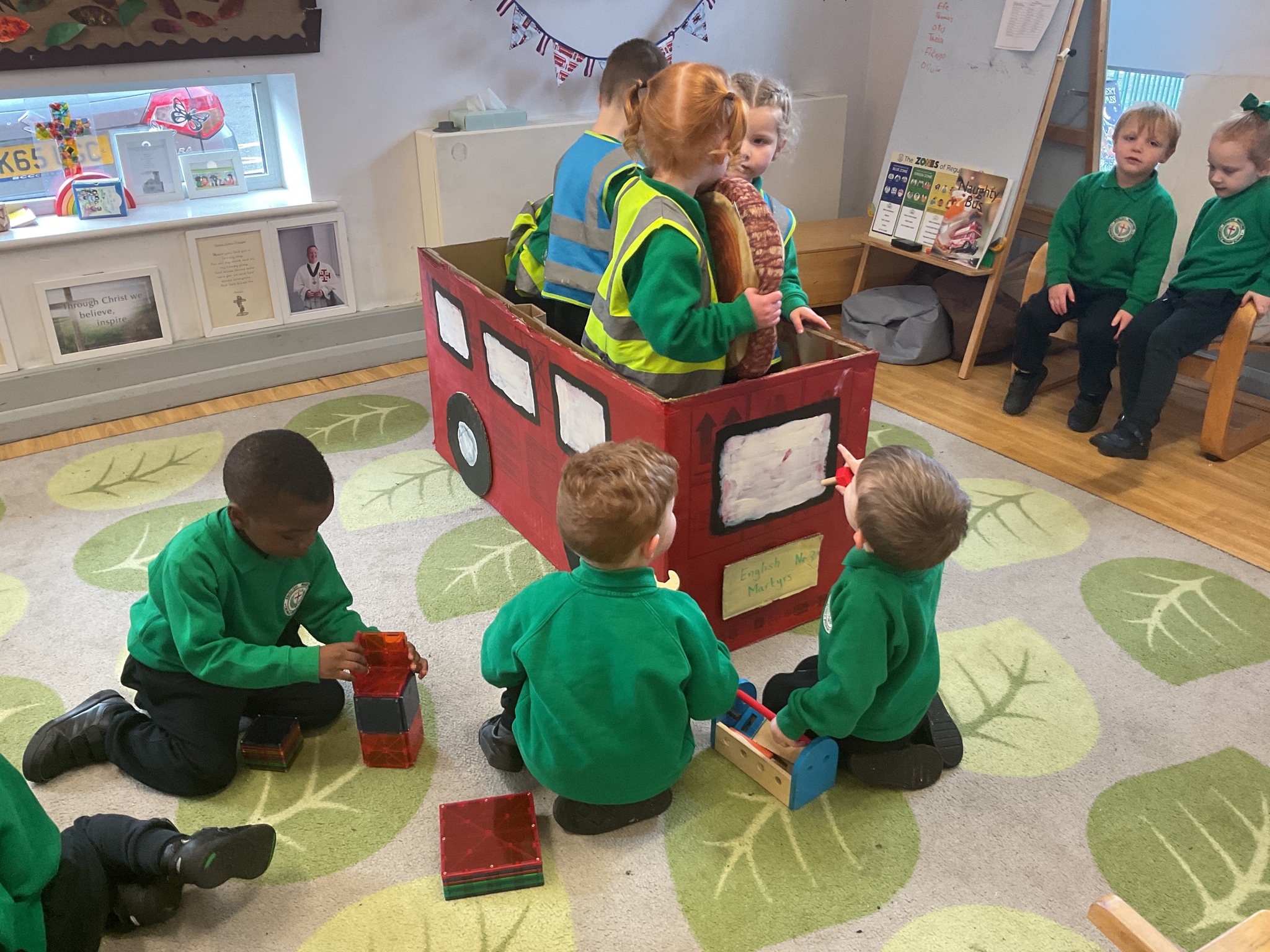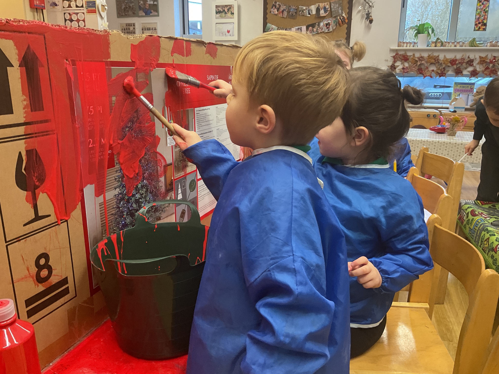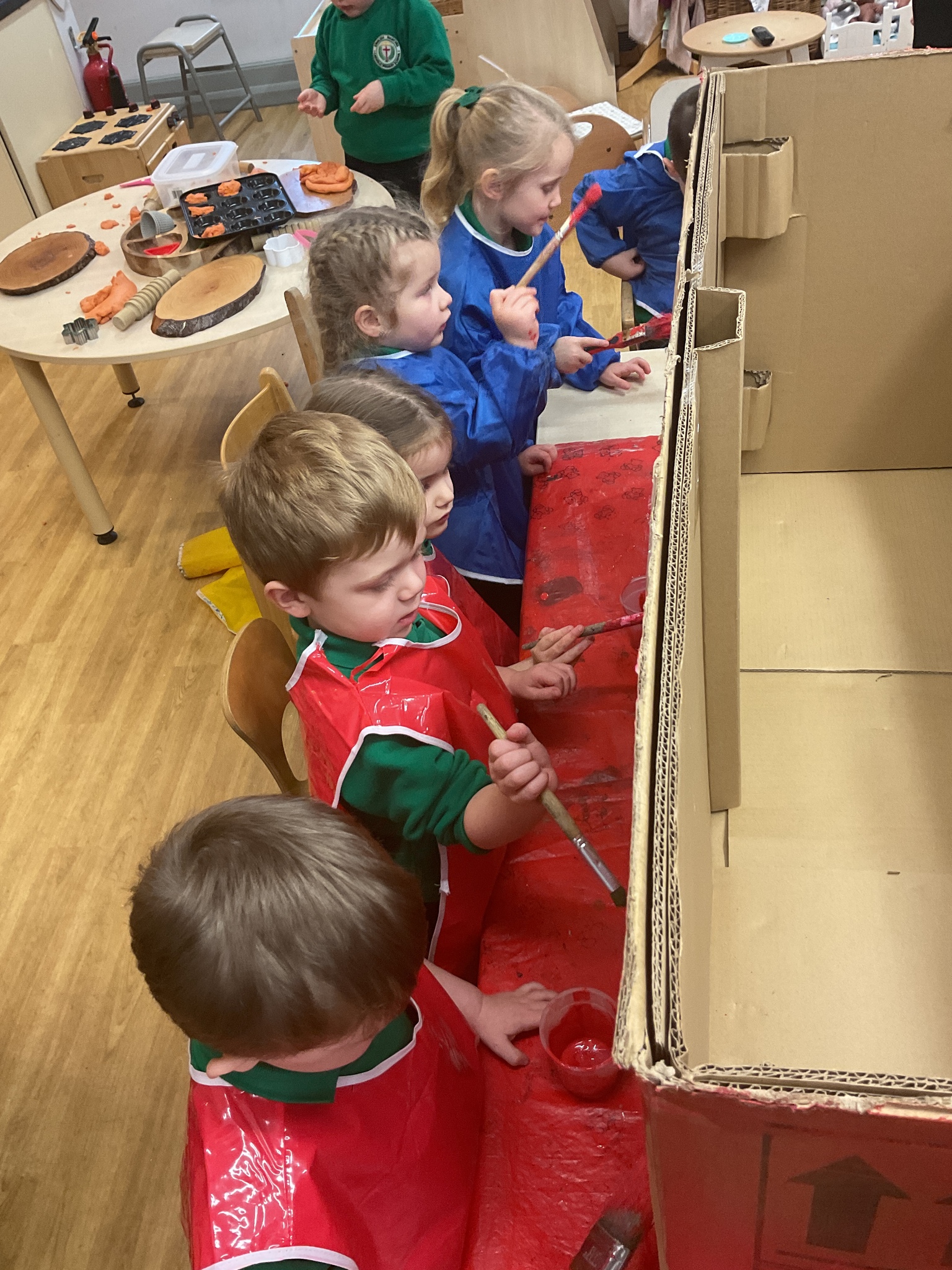 Following on from our ‘Naughty Bus’ book the children were keen to make their own bus. We found a sturdy box and the children took over, painting and creating together to get the job done! Next for the driving and travelling. We have also been talking about finding routes as part of our mathematical learning so children were heard describing the route they were taking. The bus journeys require collaboration and turn-taking but are lots of fun too.