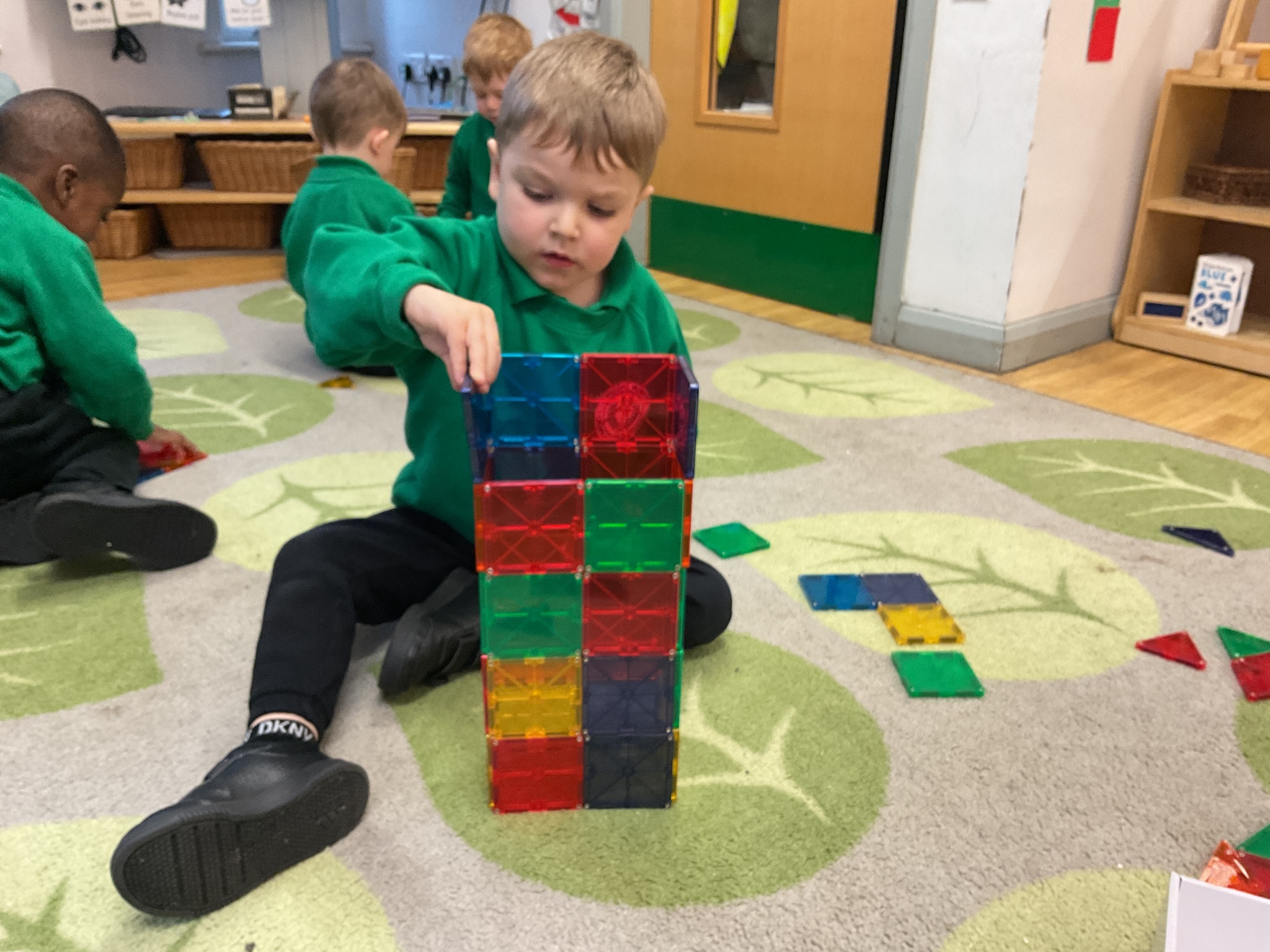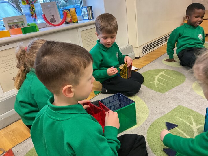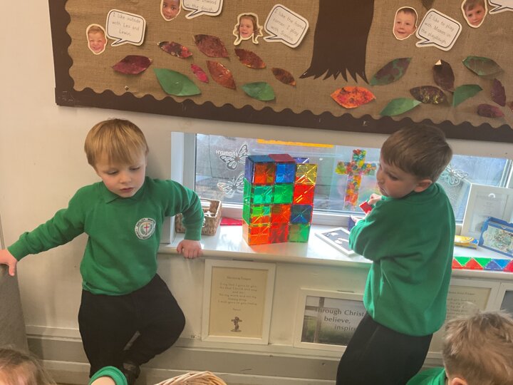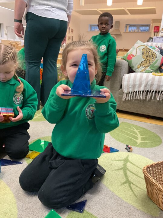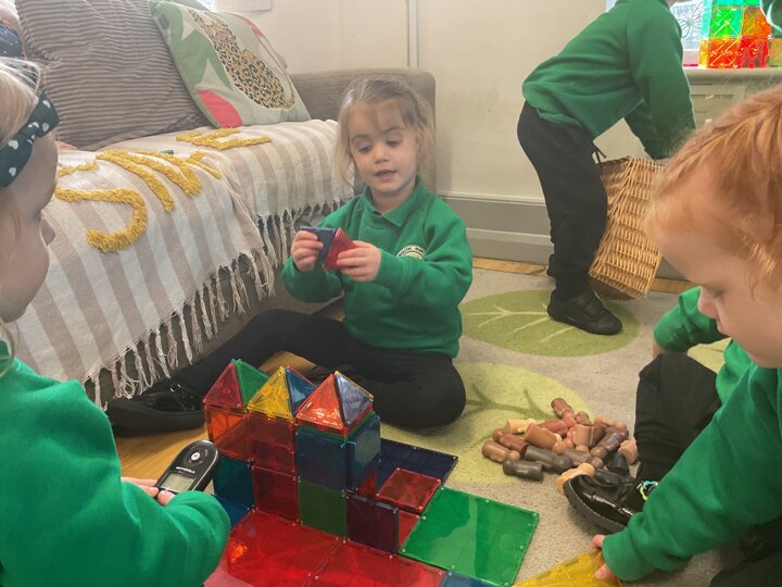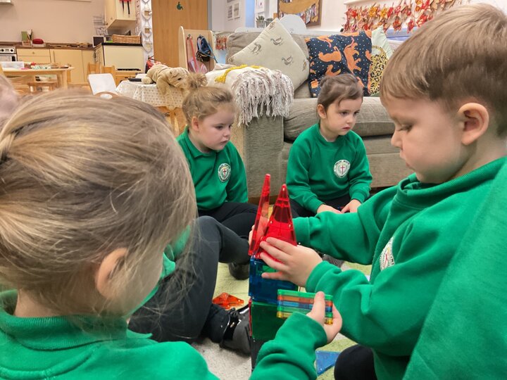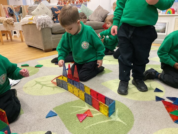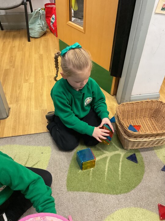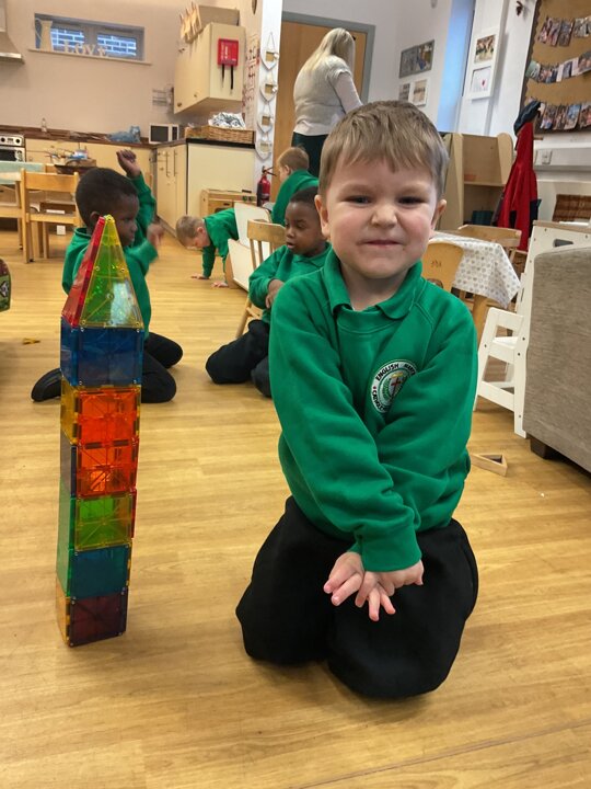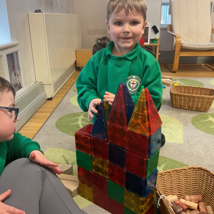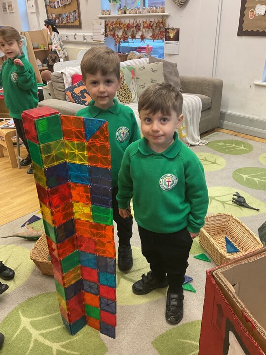 Magnetic tiles have been a recent addition to the resources in our nursery and have been extremely popular. It has been fascinating to observe the interactions of the children and the different strategies of exploring and creating used. The resource only arrived last week and building progress has been swift! We have also noticed some children who do not regularly choose construction play being totally engaged with the tiles.