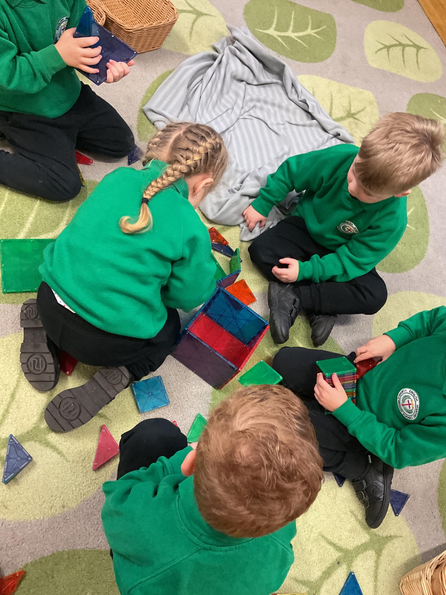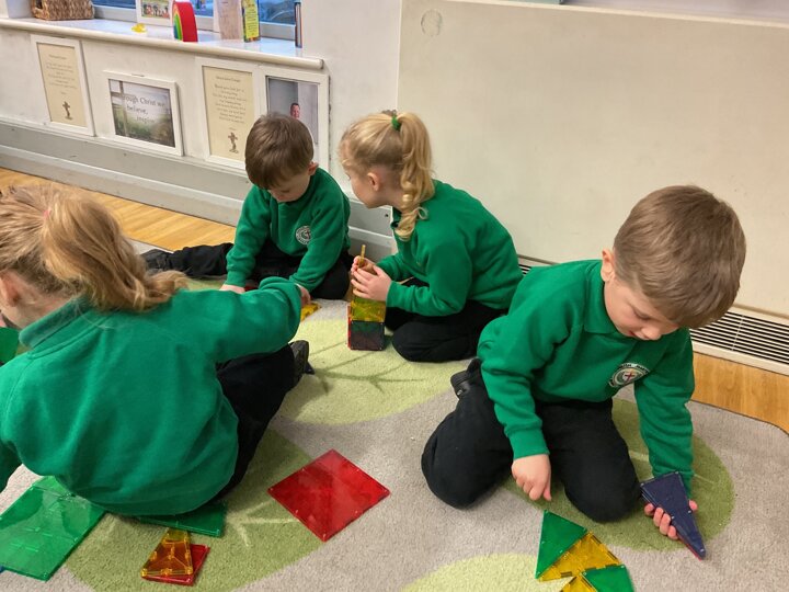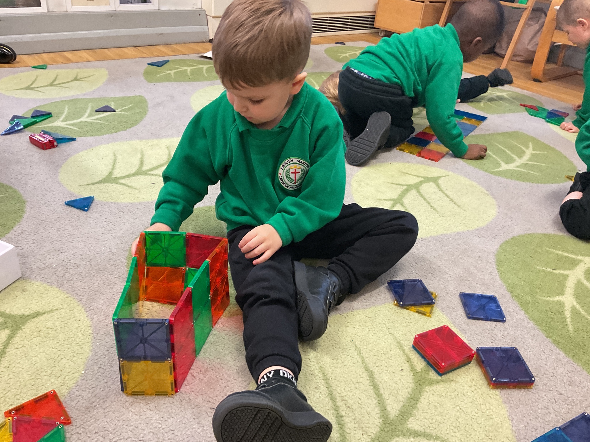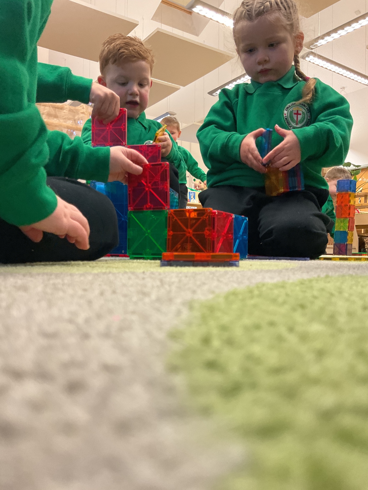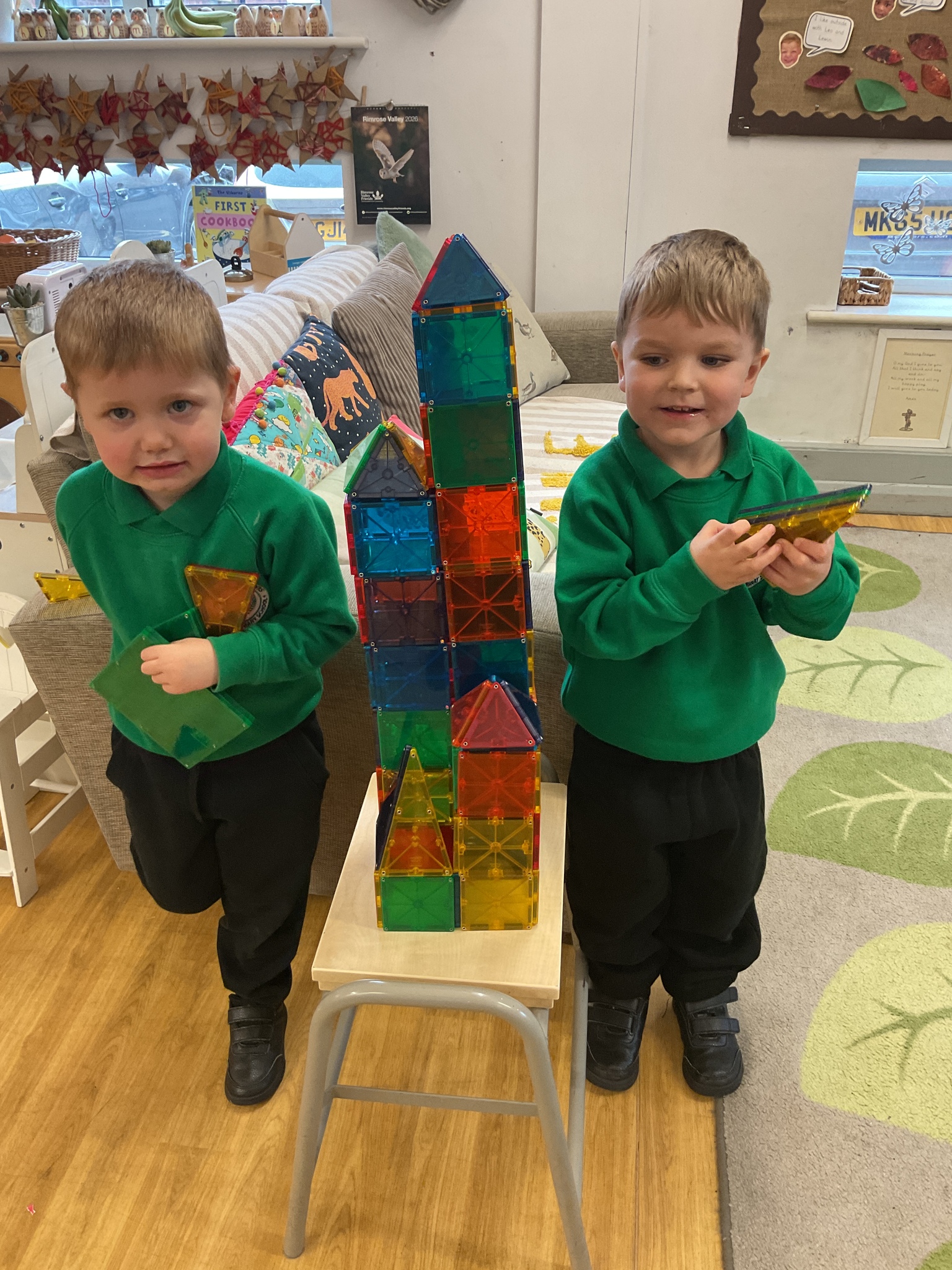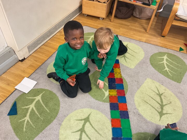 Magnetic tiles have been a recent addition to the resources in our nursery and have been extremely popular. It has been fascinating to observe the interactions of the children and the different strategies of exploring and creating used. The resource only arrived last week and building progress has been swift! We have also noticed some children who do not regularly choose construction play being totally engaged with the tiles.