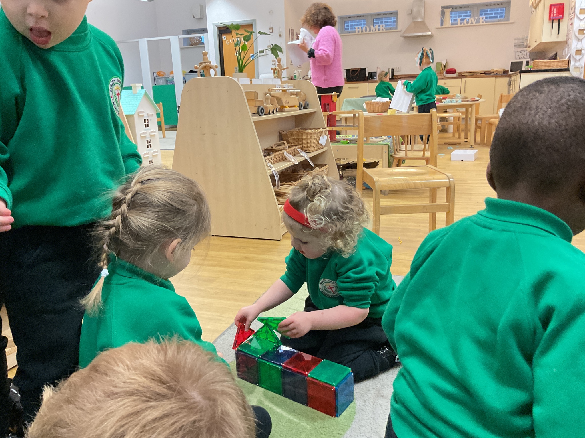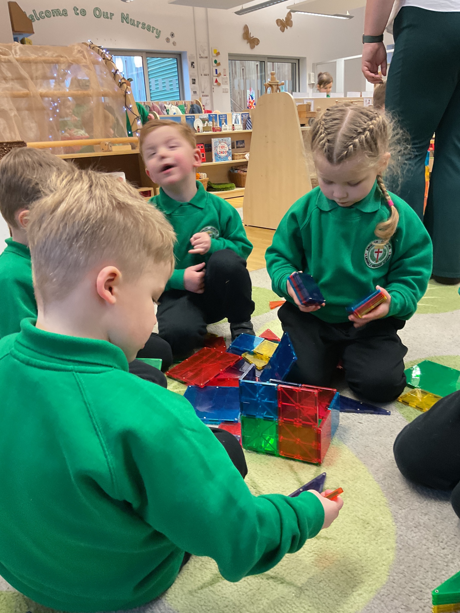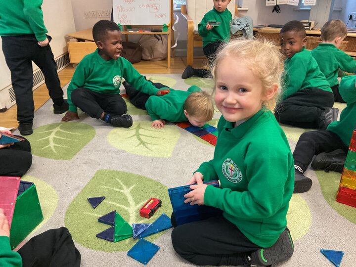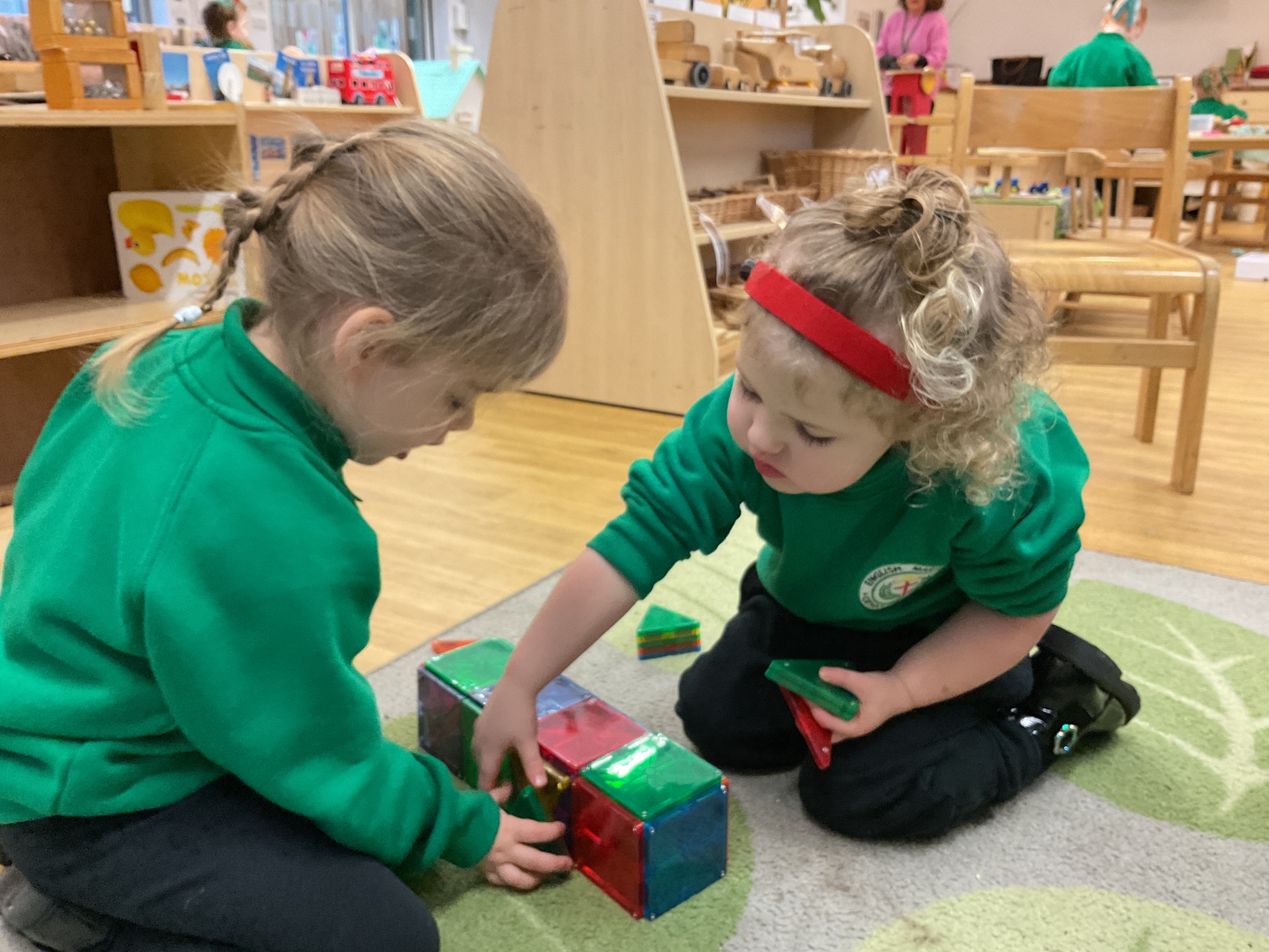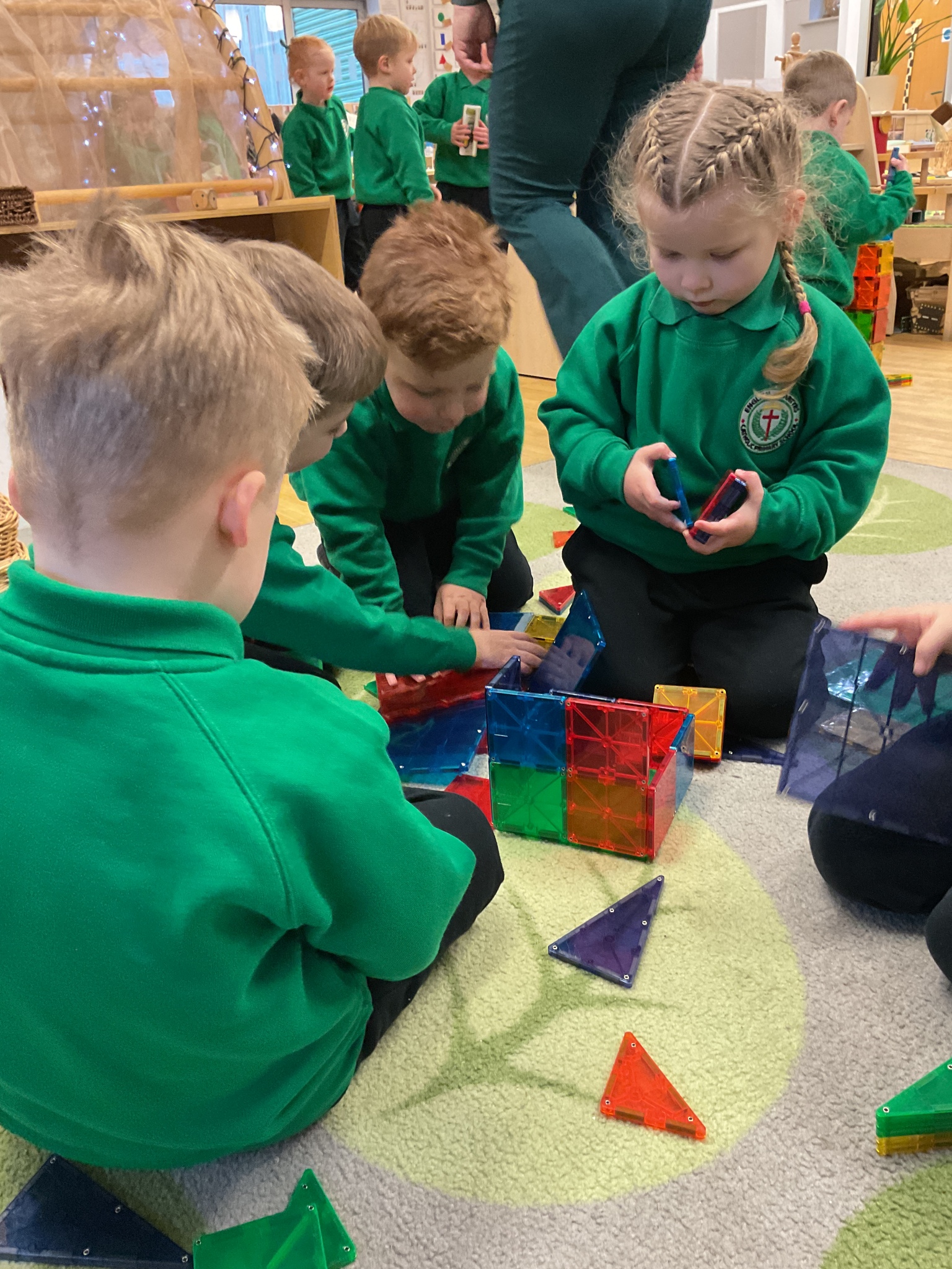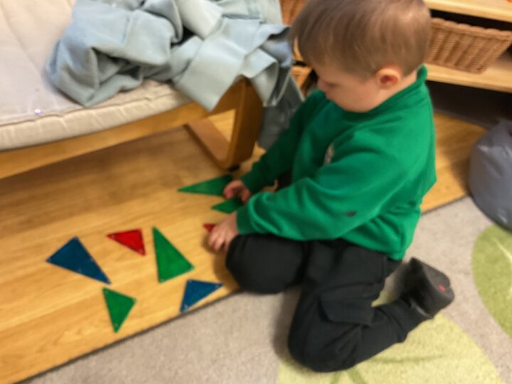 Magnetic tiles have been a recent addition to the resources in our nursery and have been extremely popular. It has been fascinating to observe the interactions of the children and the different strategies of exploring and creating used. The resource only arrived last week and building progress has been swift! We have also noticed some children who do not regularly choose construction play being totally engaged with the tiles.