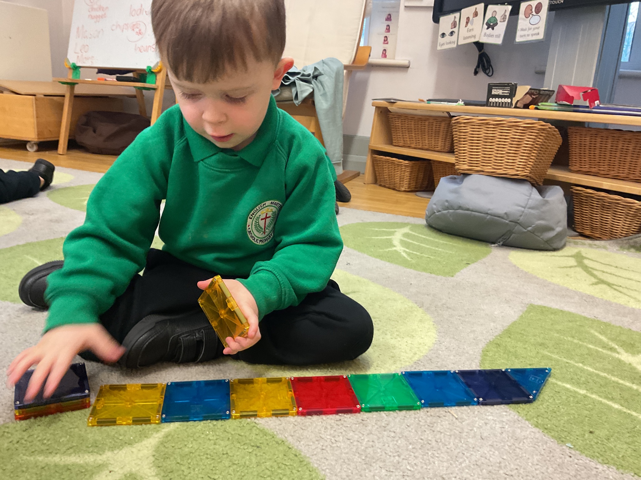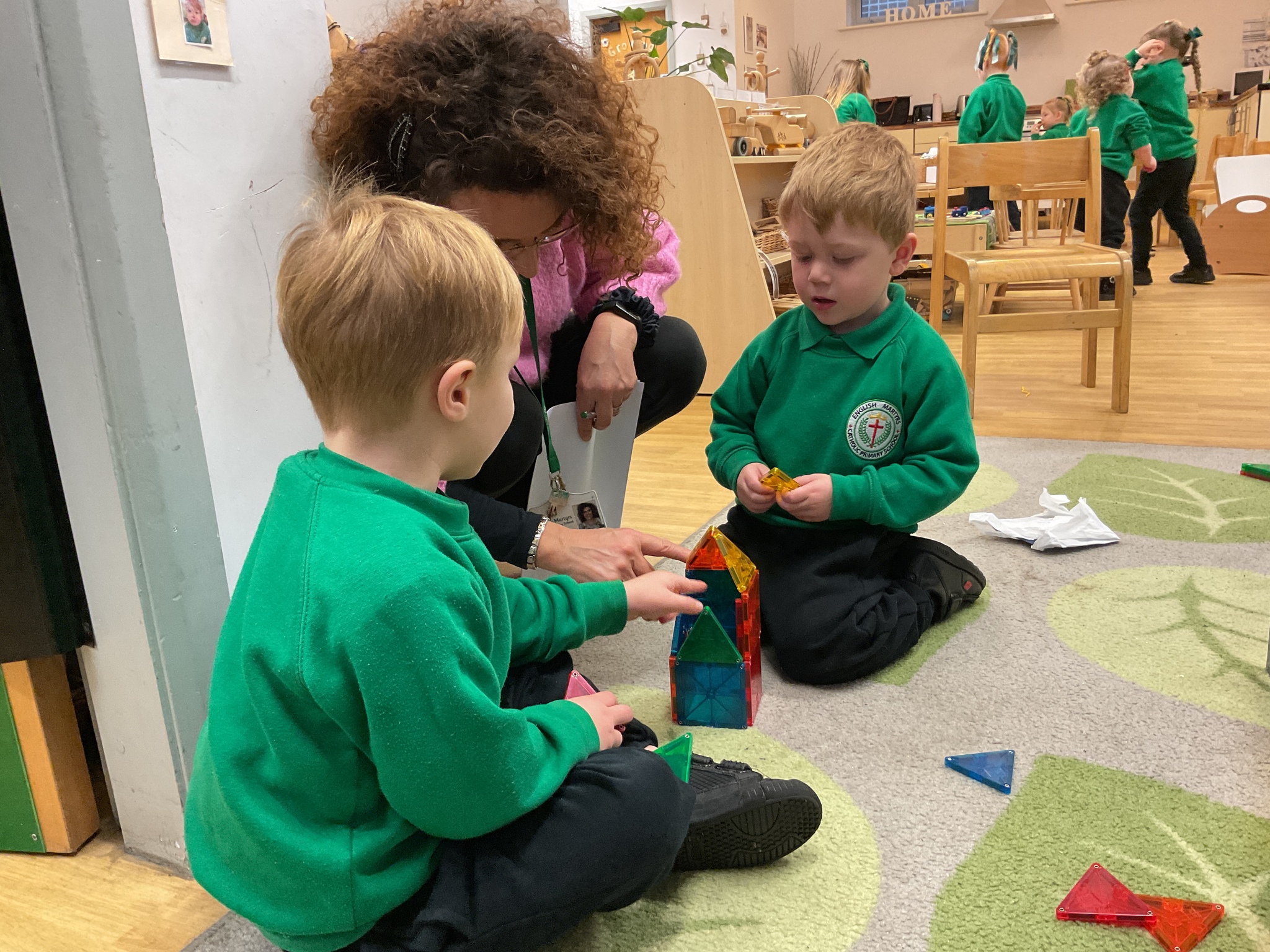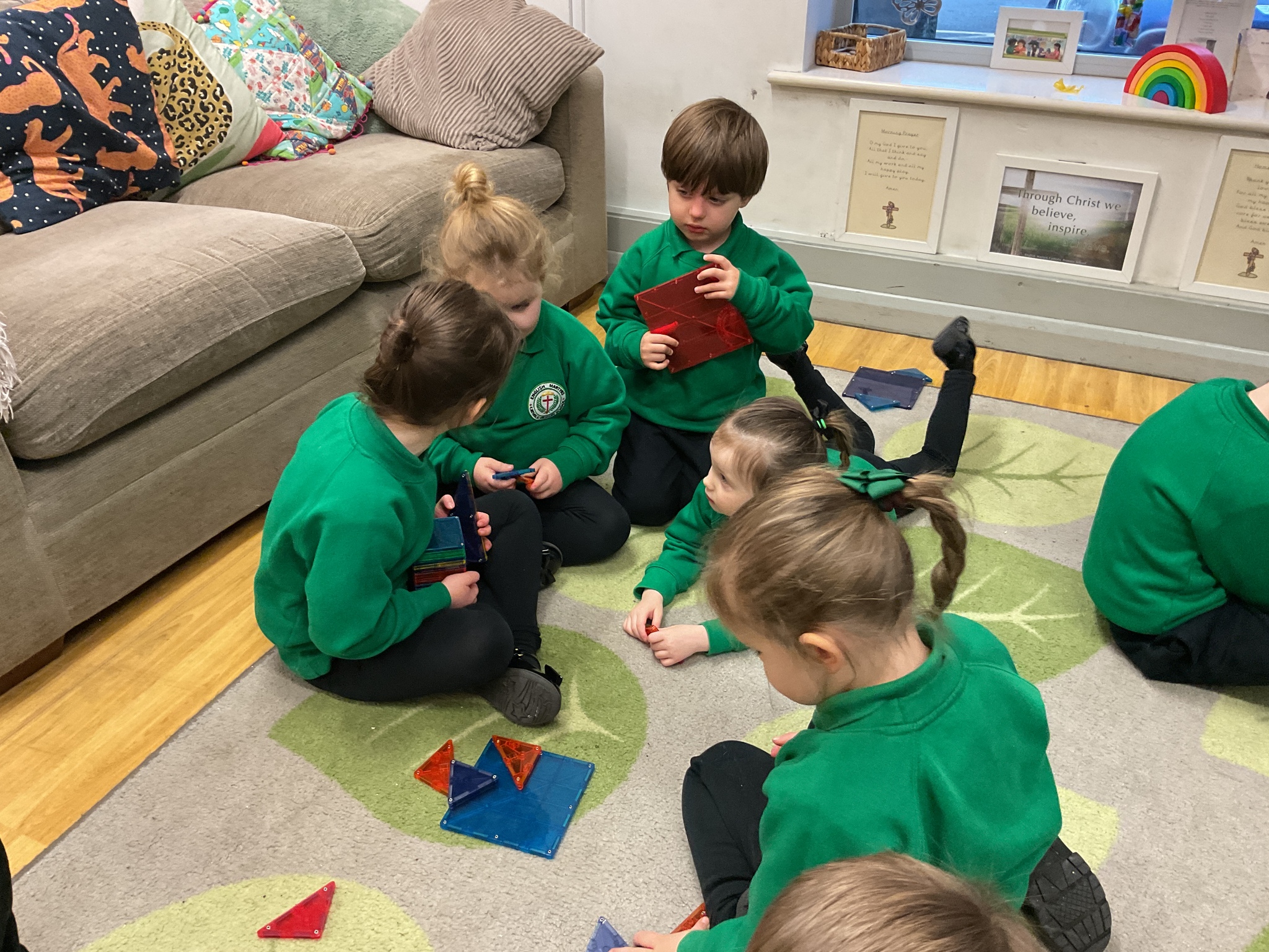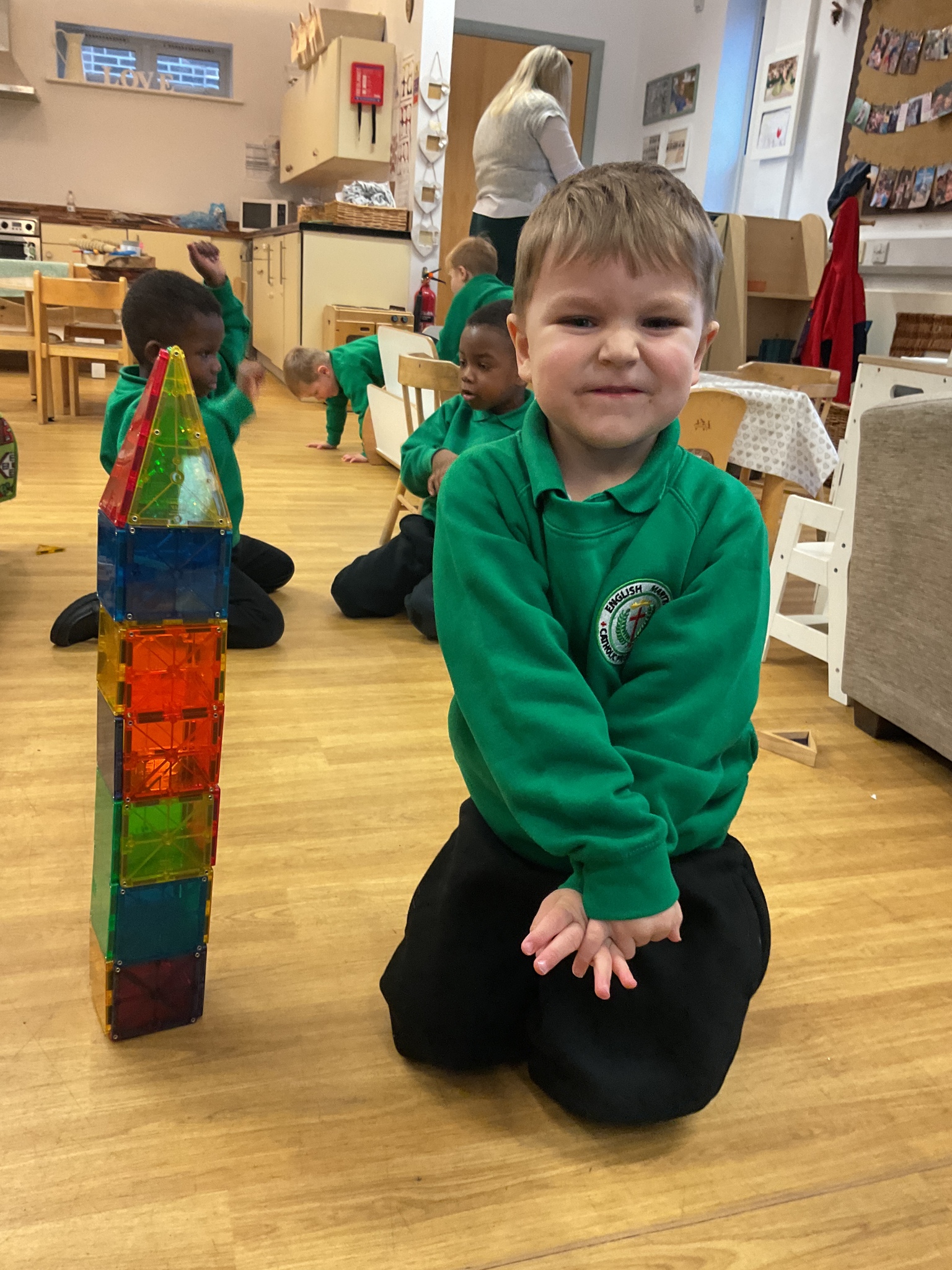 Magnetic tiles have been a recent addition to the resources in our nursery and have been extremely popular. It has been fascinating to observe the interactions of the children and the different strategies of exploring and creating used. The resource only arrived last week and building progress has been swift! We have also noticed some children who do not regularly choose construction play being totally engaged with the tiles.